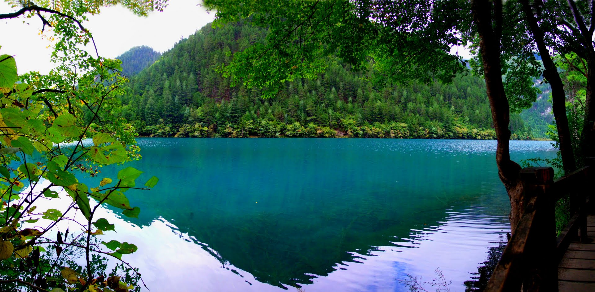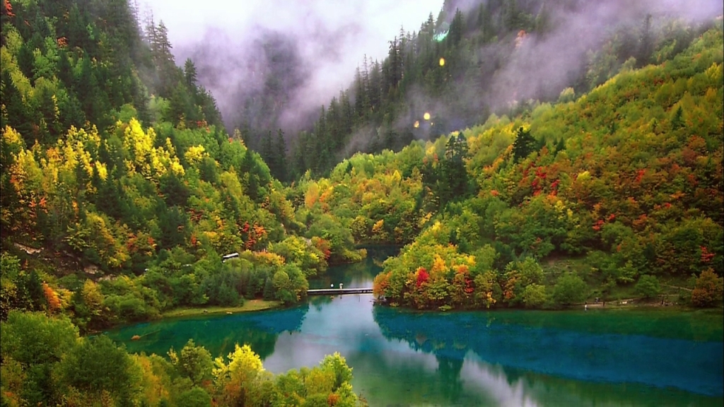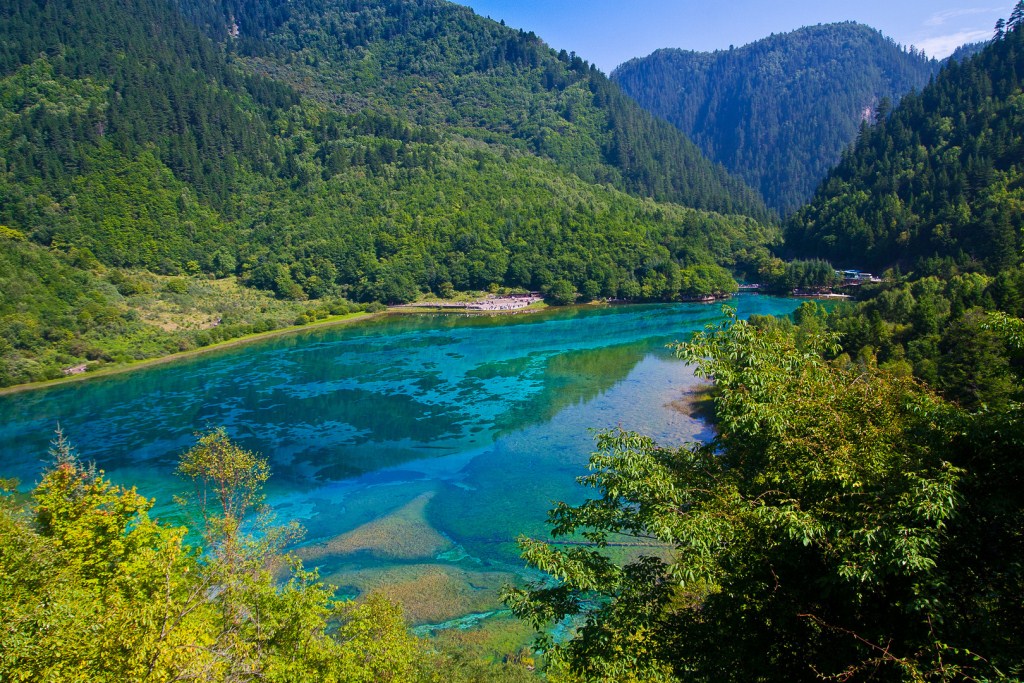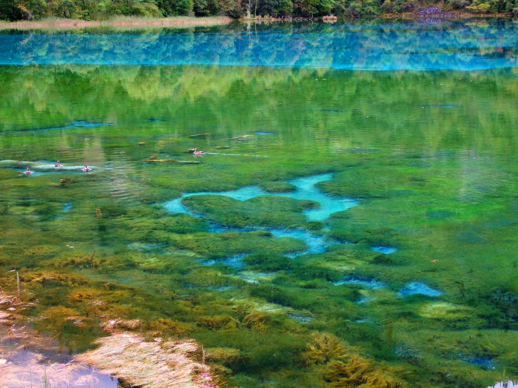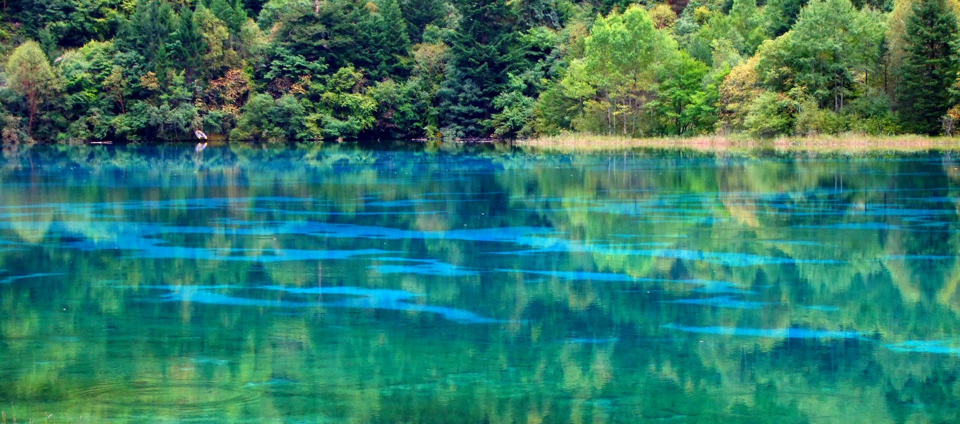 Ухуа Хай или Озеро Пяти Цветов в долине Цзючжайгоу, Китай – мелкое озеро, наполненное реликтовыми упавшими деревьями, виднеющимися сквозь кристально чистые воды. Многоцветность озера возникла из-за реакции лежащих в озере деревьев на определённые минералы. Название – Озеро Пяти Цветов – произошло из-за того, что в любое время года в озере присутствуют как минимум 5 различных цветов. Эту жемчужину Цзючжайгоу также называют Озеро Павлина.