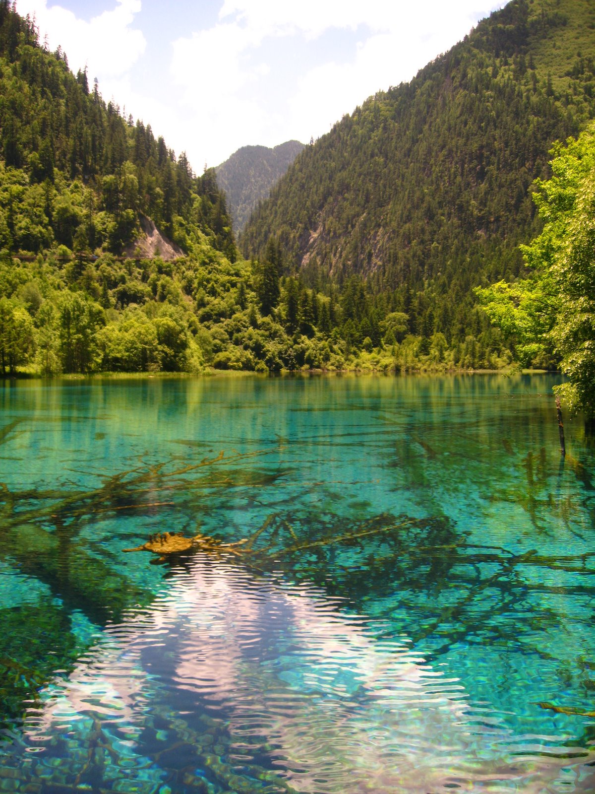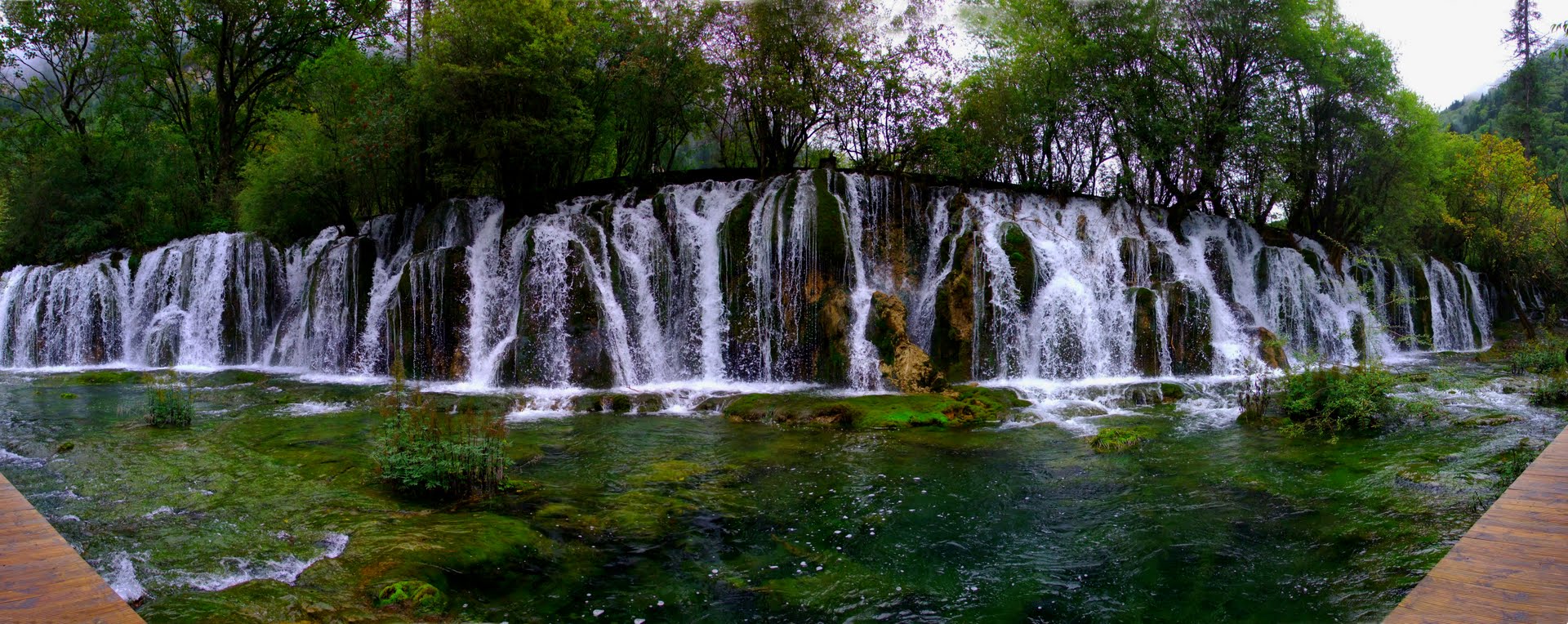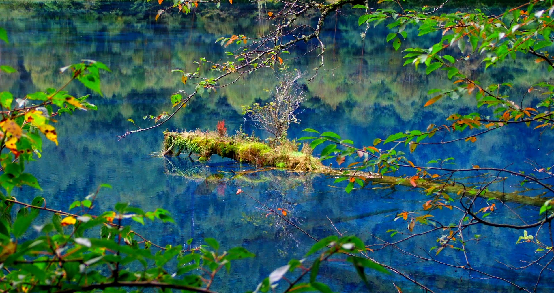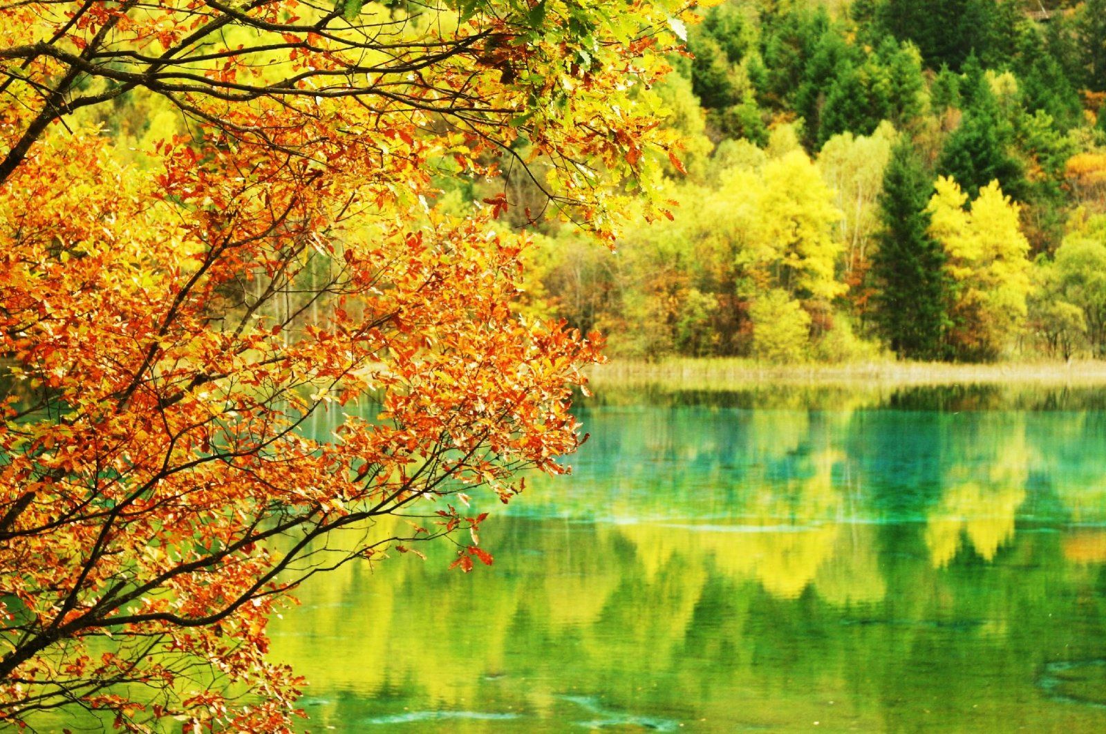 Ухуа Хай или Озеро Пяти Цветов в долине Цзючжайгоу, Китай – мелкое озеро, наполненное реликтовыми упавшими деревьями, виднеющимися сквозь кристально чистые воды. Многоцветность озера возникла из-за реакции лежащих в озере деревьев на определённые минералы. Название – Озеро Пяти Цветов – произошло из-за того, что в любое время года в озере присутствуют как минимум 5 различных цветов. Эту жемчужину Цзючжайгоу также называют Озеро Павлина.