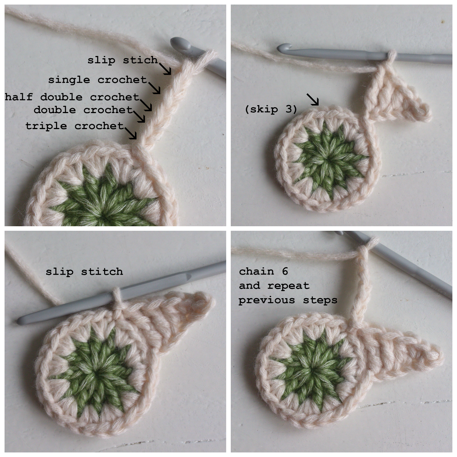 2. Сформированный лучик прикрепляем полустолбиком к предыдущему ряду в 4 петлю.