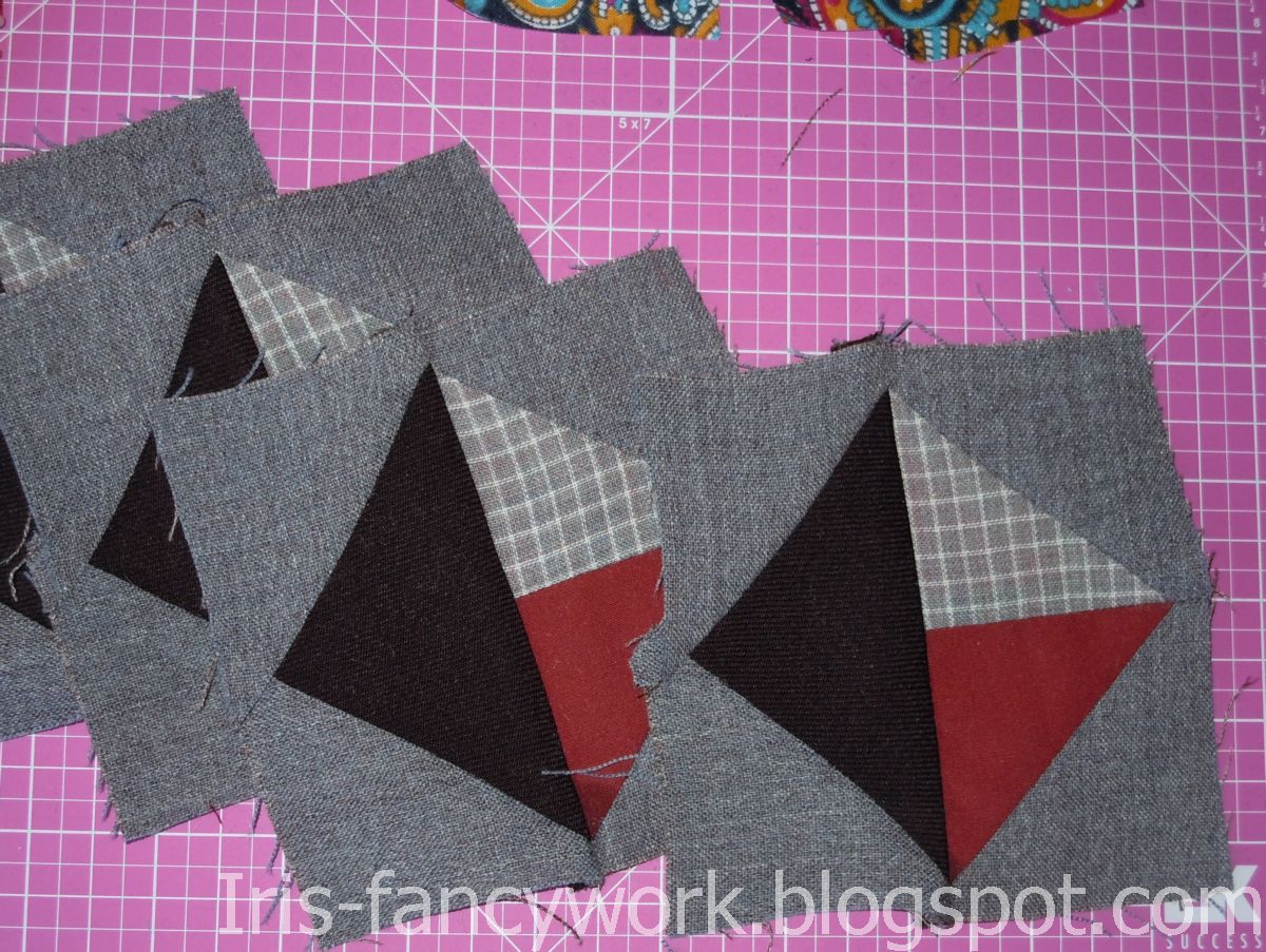 Сшиваем по диагонали светло-серые и бордовые треугольники с серыми “фоновыми” треугольниками.