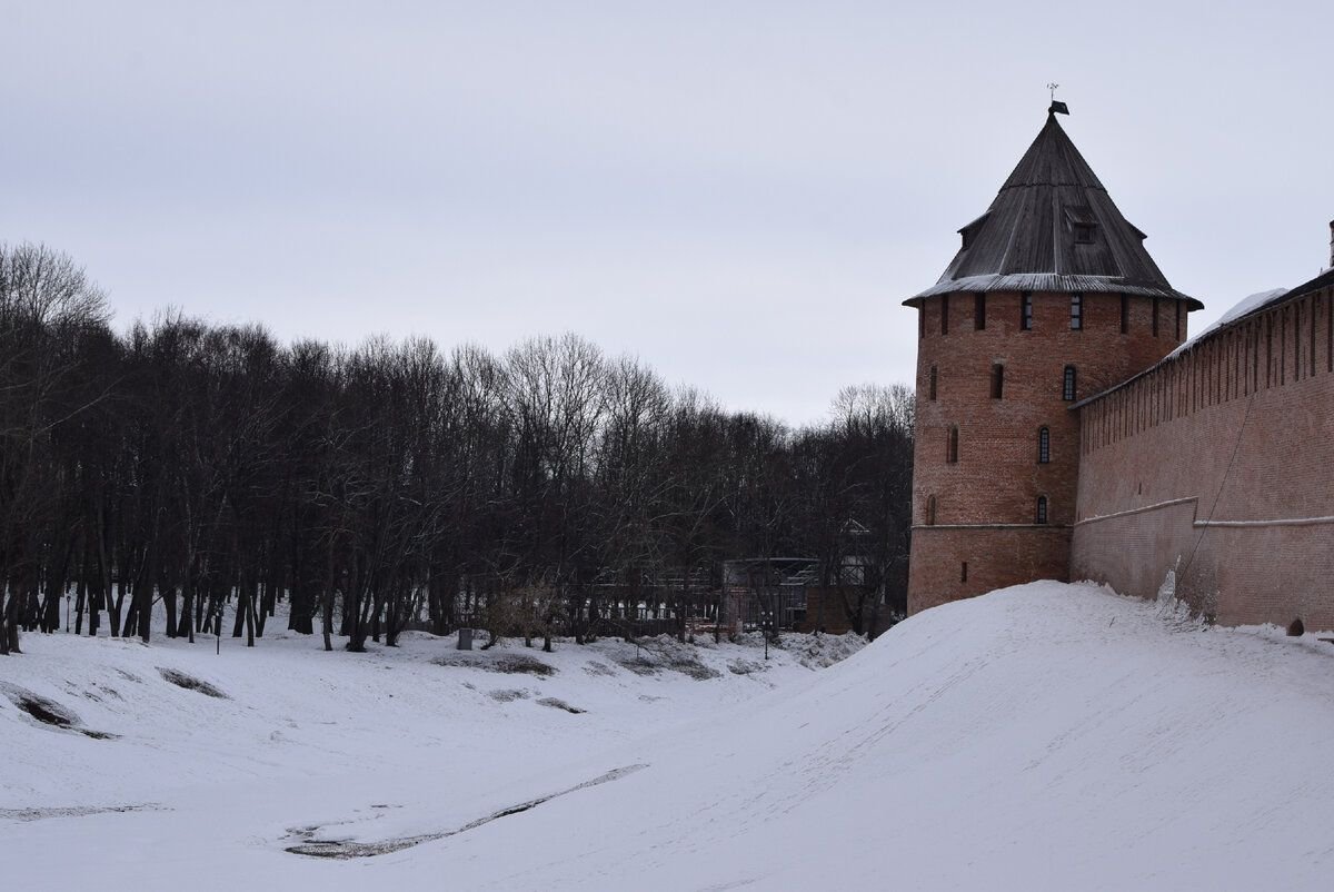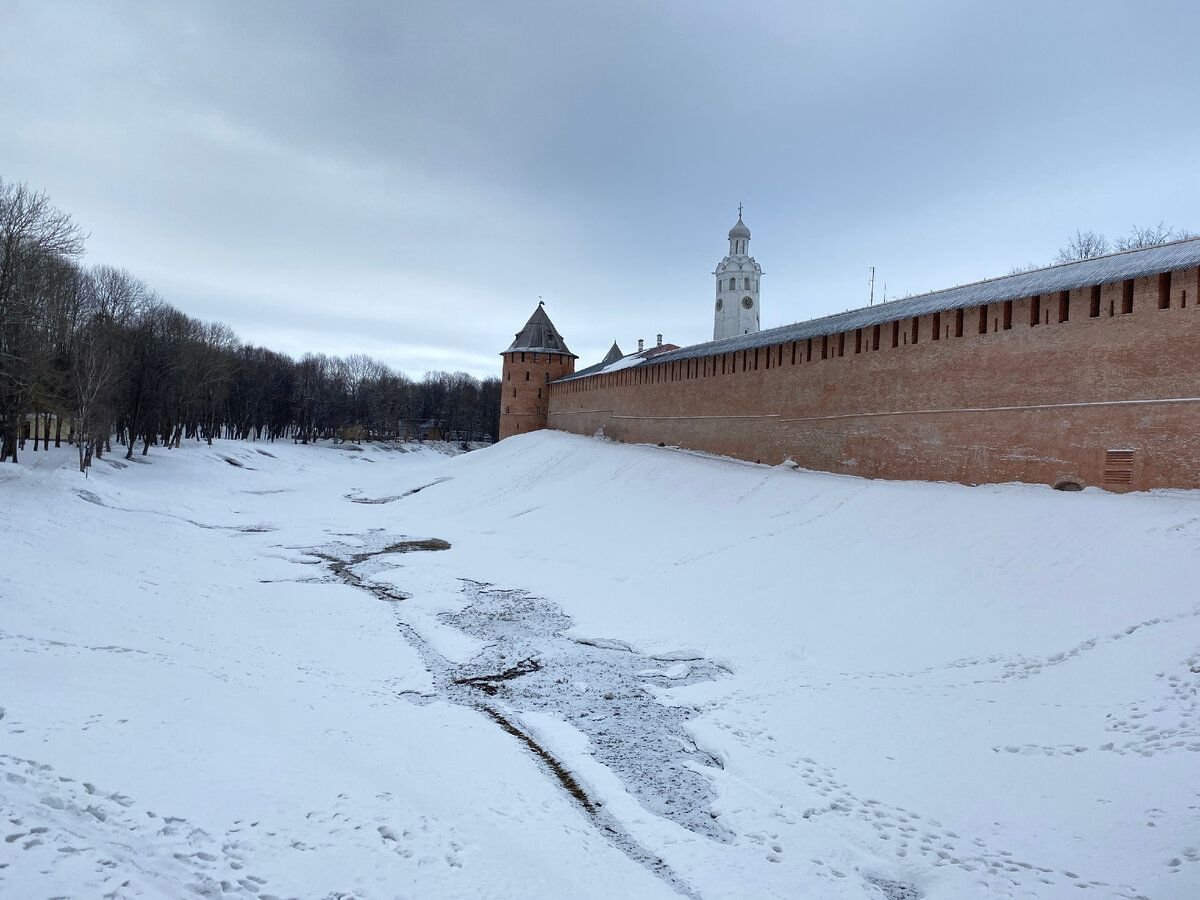 Новгородский кремль в Великом Новгороде Детинец стоит на холме и величественно возвышается над, огибающим его, рвом, который некогда был заполнен водами реки Волхов, и над всем окружающим пространством.