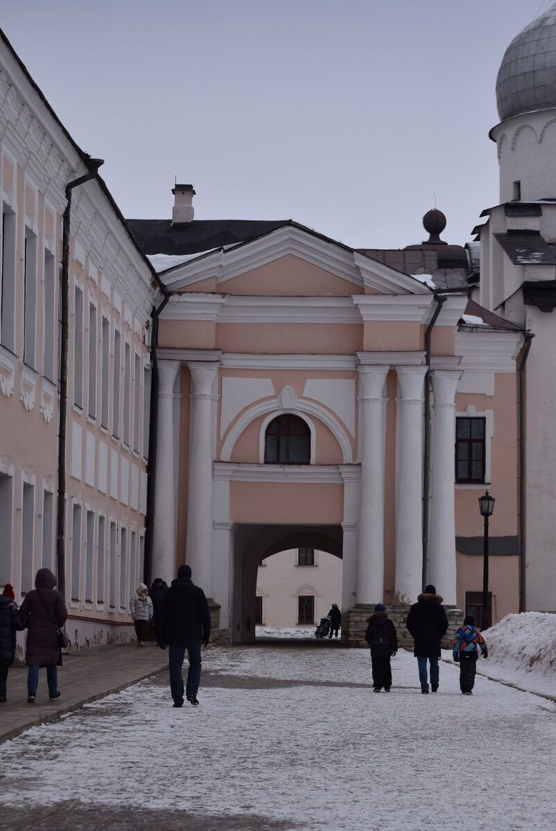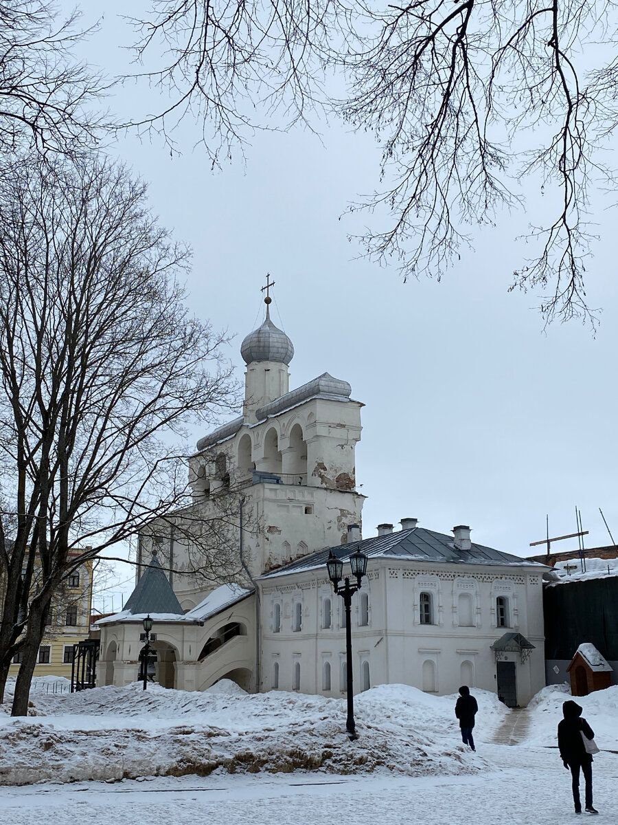 Часть здания Новгородской областной филармонии, которая расположена на территории кремляВид на Софийскую звонницу
