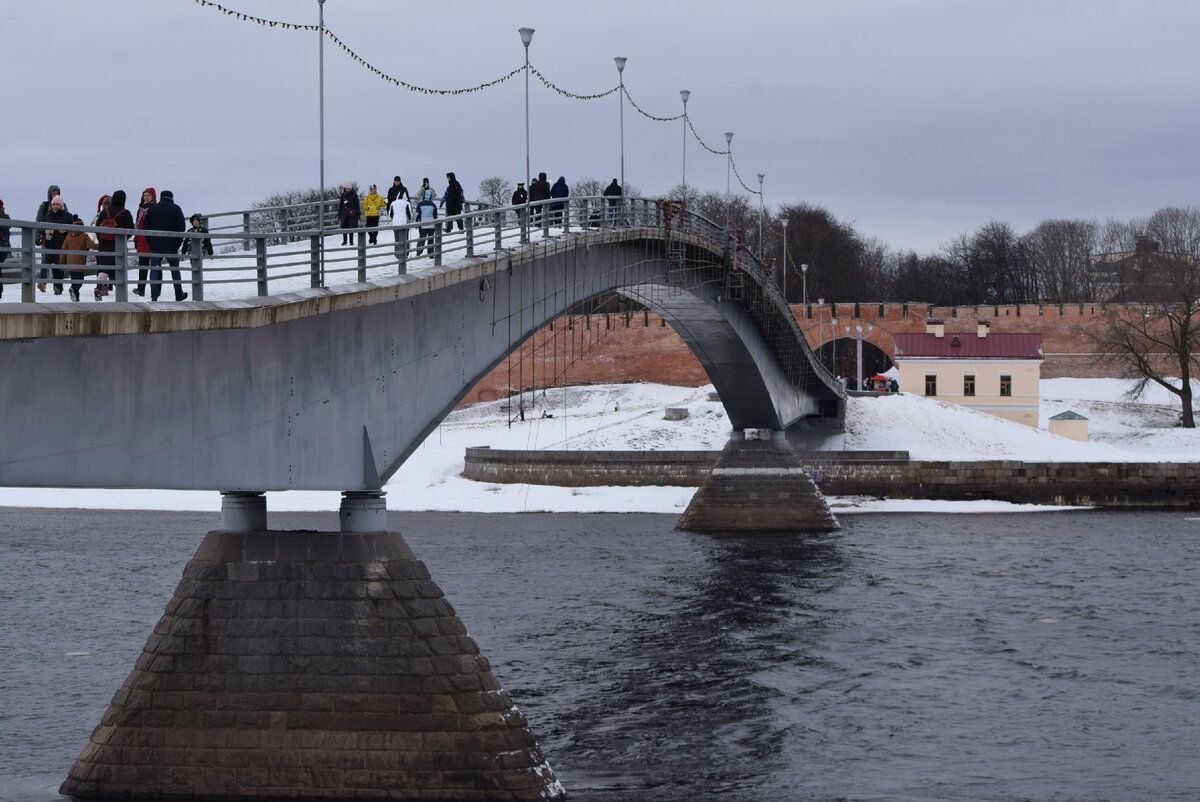 Прогулявшись еще немного по мощеным площадям и улицам кремля, мы прошли сквозь ворота, и вышли к огромному пешеходному мосту, изогнутому дугой над широченным руслом реки Волхов.
