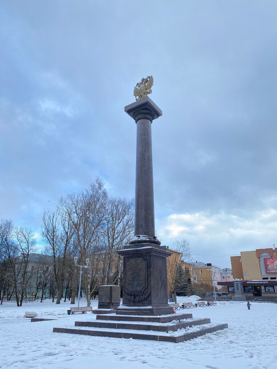 Автовокзал в Великом Новгороде Пройдя несколько минут по Воскресенскому бульвару, мы оказались на площади Карла Маркса, где в самом ее центре возвышается стела, которая была установлена 8 мая 2010 года в честь присвоения городу звания «Город воинской славы».