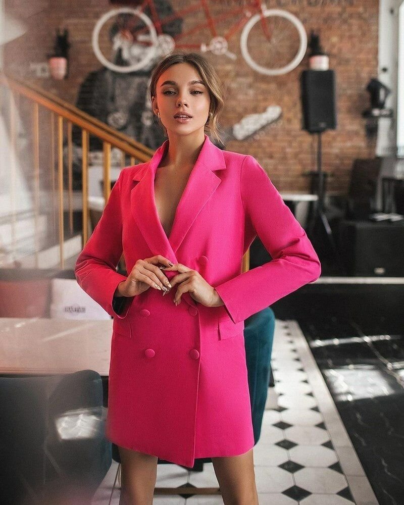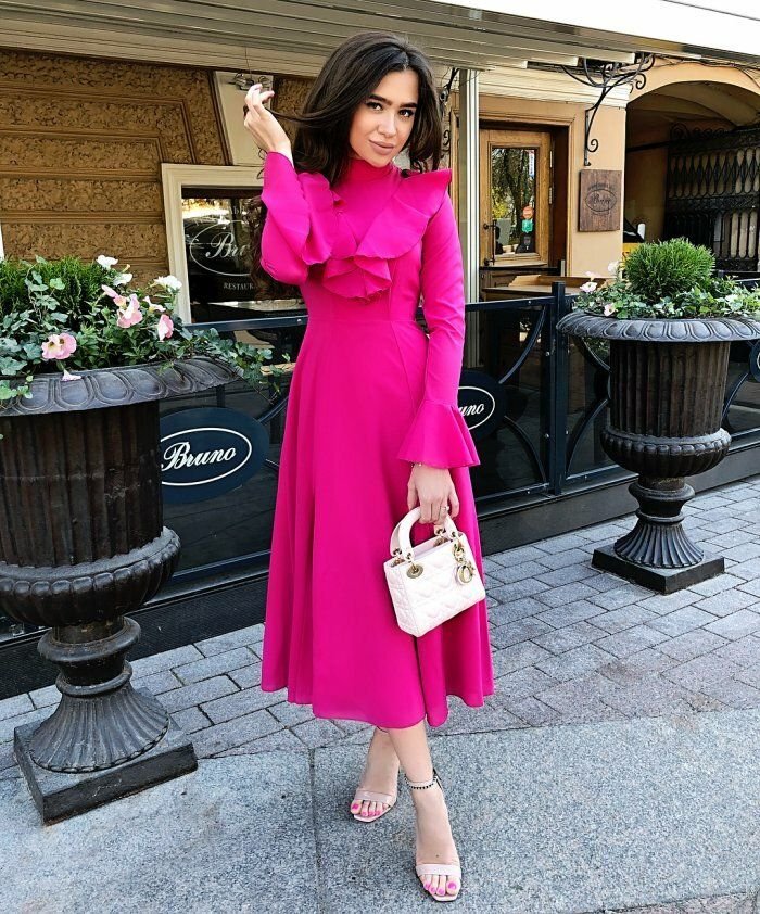 Не стоит ограничиваться исключительно черными моделями. Успешная барышня имеет полное право подобрать себе яркое платье. Какие цвета ассоциируются с успехом? Винный, изумрудный, красный и синий. Однако при правильном подходе, задать нужный тон удастся, например, и в изделии оттенка фуксия.