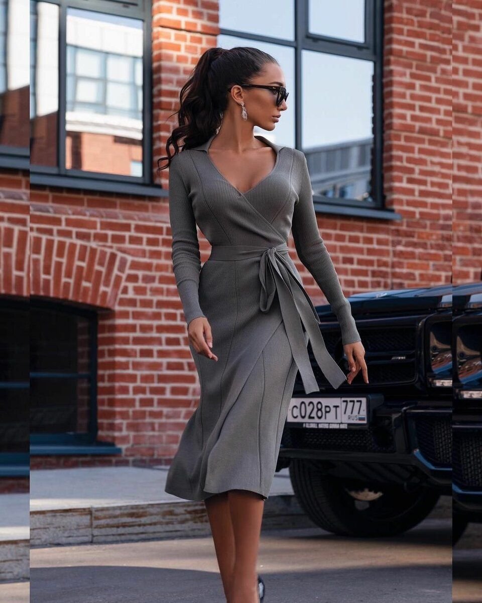 Еще один способ подчеркнуть презентабельность деловой леди - надеть платье с запахом. В лаконичном исполнении, оно гарантированно поможет подчеркнуть все ваши достоинства, и не только визуальные.