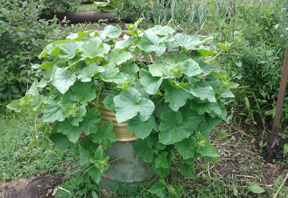 Перед перевалкой, полностью обрезаю дно и горлышко бутылки. Устанавливаю “рукав” на разнос и начинаю заполнять. На 1⁄3 наполняю перепревшим навозом. Огурцы отзывчивы на органику и навоз отдает корешкам тепло. Оставшуюся часть бутылки наполняю почвой с огорода, предварительно ее заношу на неделю в тепло. Когда бутылки подготовлены, осторожно переношу в них огуречную рассаду вместе с земляным комом.Если на улице плюсовая температура, днем выношу бутылки на улицу, на ночь заношу в дом. Если есть теплица, то можно не таскаться с рассадой, а поставить ее в теплице, на ночь дополнительно накрывая ее пленкой. В середине мая я уже имею цветущие лианы, которые переношу в бочку, также путем перевалки. Осторожно делаю надрез на “рукаве” бутылки и убираю его. А рассаду помещаю в подготовленный грунт. Рассада такую перевалку переносит безболезненно и уже через 1-2 недели начинает радовать первыми плодами. Если неожиданно вернулись заморозки, устанавливаю на бочку дуги и натягиваю пленку. Лианы надежно защищены.