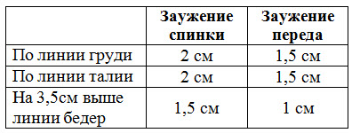 3. При построении исходной выкройки купальника не требуется прибавка на свободу облегания по линии груди, талии и бедер, учитываемая при построении базовой выкройки платья, даже если на этой базе будет моделироваться купальник из неэластичной ткани. Заужение на величину прибавки на свободу облегания по боковой линии спинки немного больше, чем по переду (для округления величин заужения). (смотрите схему)