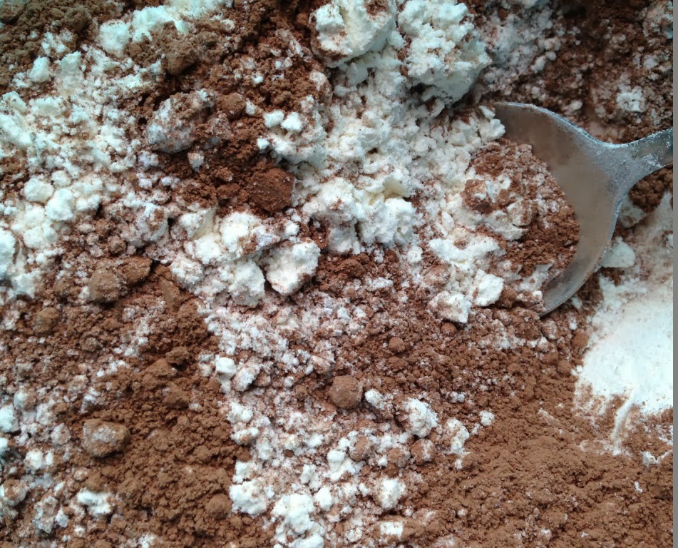 Смешать сухие ингредиенты - оба вида муки, какао-порошок и разрыхлитель.