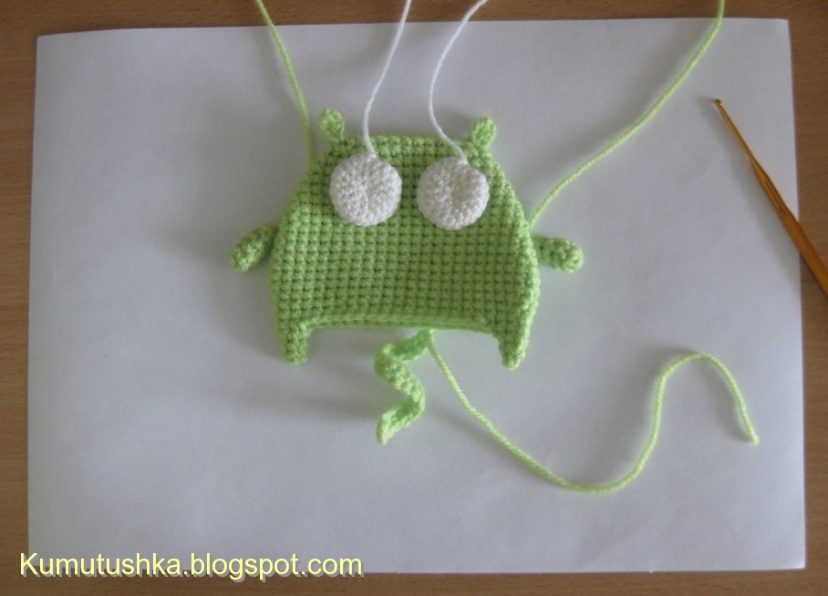· Пряжа: основного цвета и белого (для глазок). В качестве основной можно взять совершенно любую пряжу, Шлёпкин получится всегда. Сейчас (для наглядности) будем вязать из «Детской новинки» (200 м/50 г) салатового цвета)))