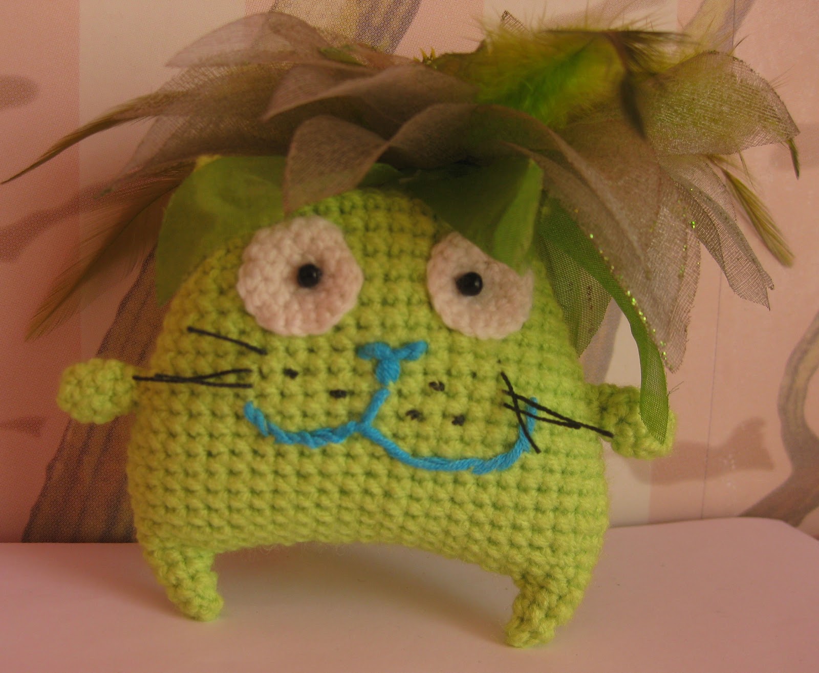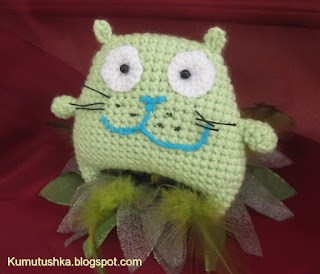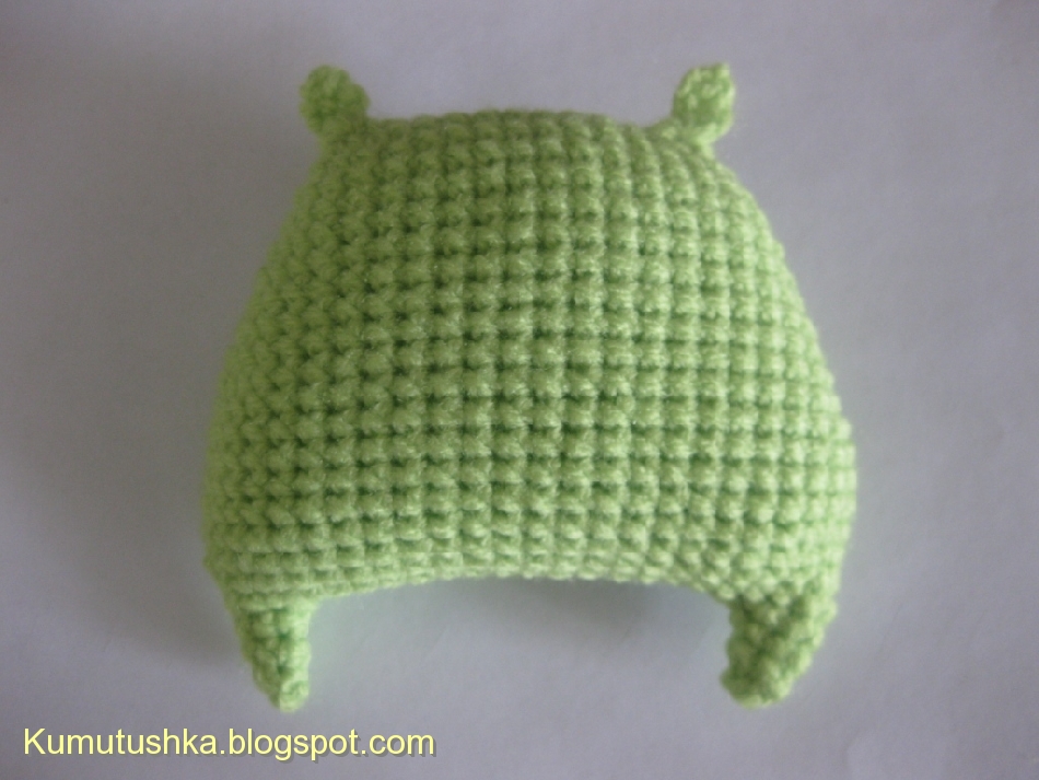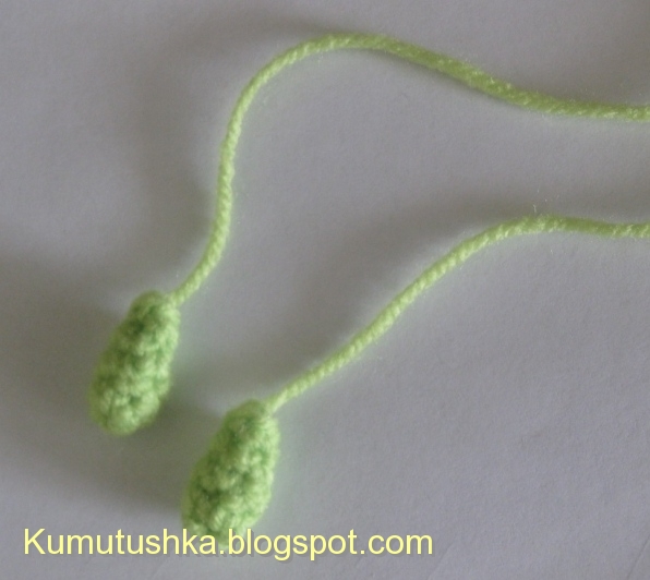 За самый край макушки сбоку присоединить нить и провязать 3 в.п., сделать 2 накида на крючок, провязать первый накид, затем три оставшиеся петли провязать вместе, в.п. Обрезать нить не очень коротко и продеть её через цепочку воздушных петель, спрятать внутрь.