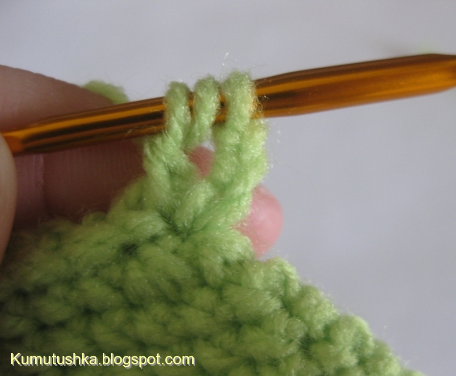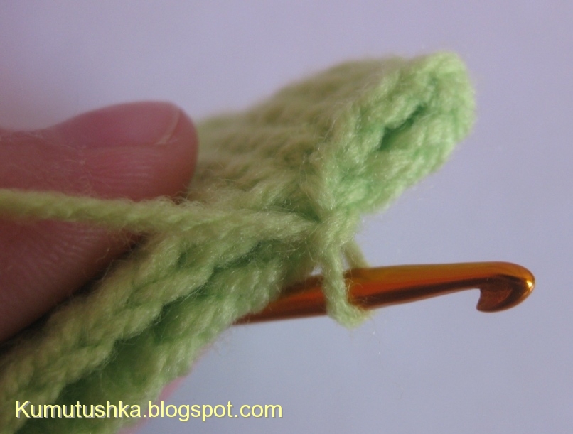 2) Во вторую п. от крючка вяжем 2 сбн (т.е. пр.), 8 сбн, 4 сбн в одну петлю (так мы оказываемся на другой стороне), 8 сбн, пр. (24)