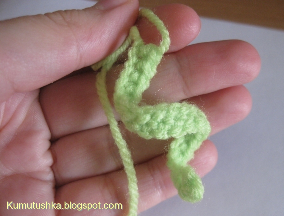 20 в.п. во вторую п. от крючка 3 сбн, 18 сбн. Оставить нить для пришивания и обрезать.