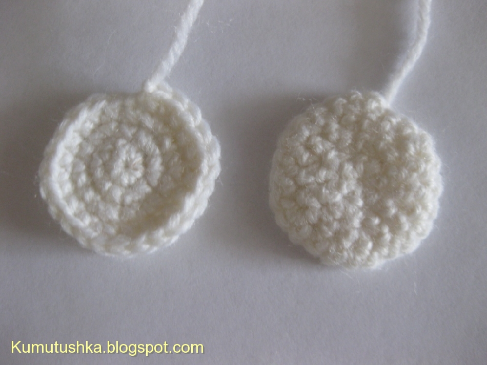 Глазки будем пришивать лицевой стороной внутрь. Так как на лицевой видна спираль из бороздочек. Вот для сравнения лицевая и изнаночная стороны