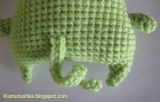 Наша лапка вяжется на 6-ти петельках. Далее вяжем 2 маленьких рядочка без изменений (т.е. 12 сбн), затем 2 сбн, уб, 2 сбн (т.е. уб. делаем по внешней стороне лапки). Обрезаем нить, продеваем за задние полупетли, стягиваем, нить прячем внутрь.