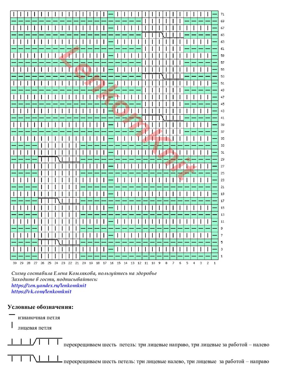 На рисунке - схема узора, зеленым цветом отмечен раппорт переплетений, вывязанных в центре. На спинке вместо этого центрального узора вяжем полупатентную резинку.