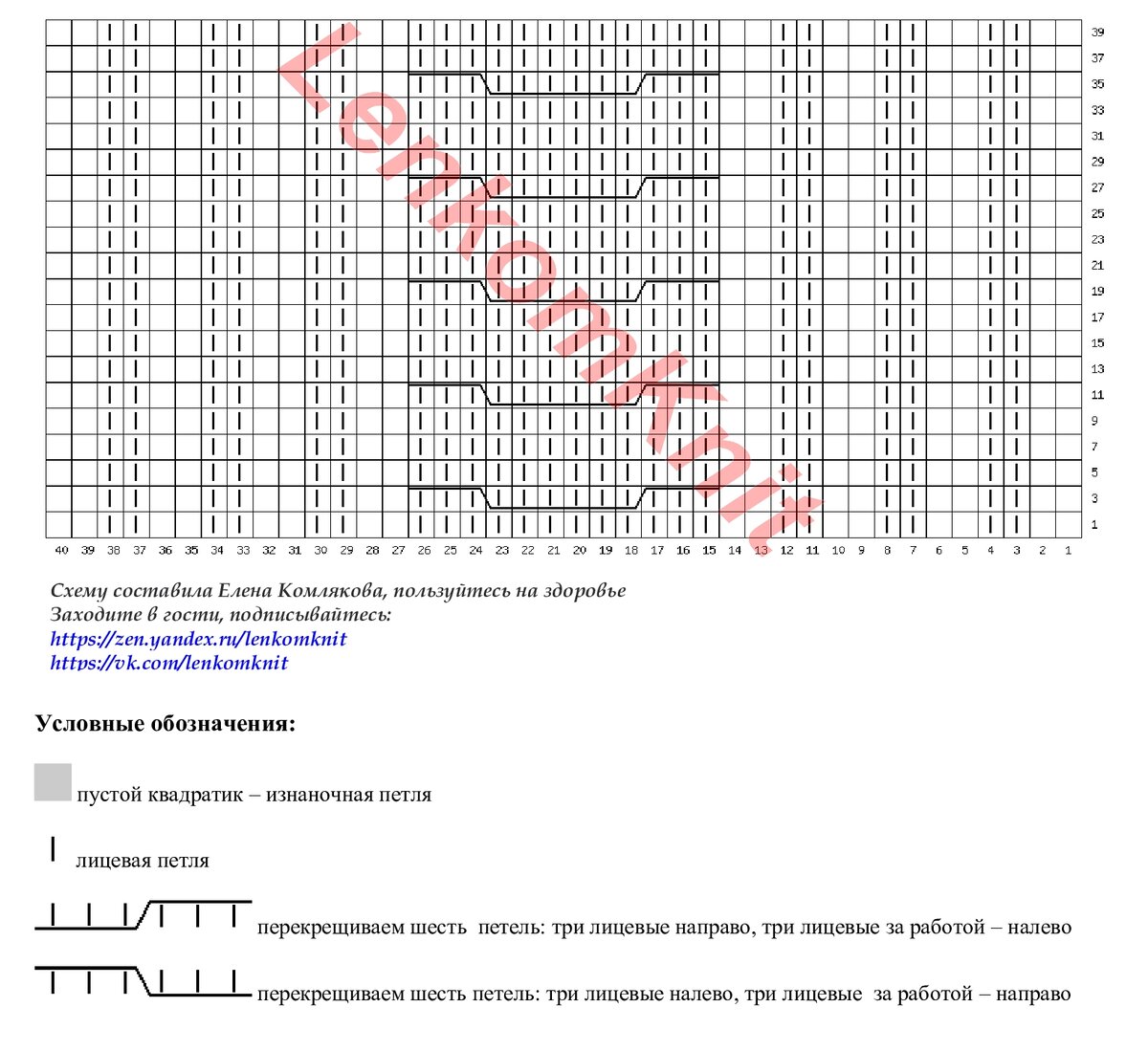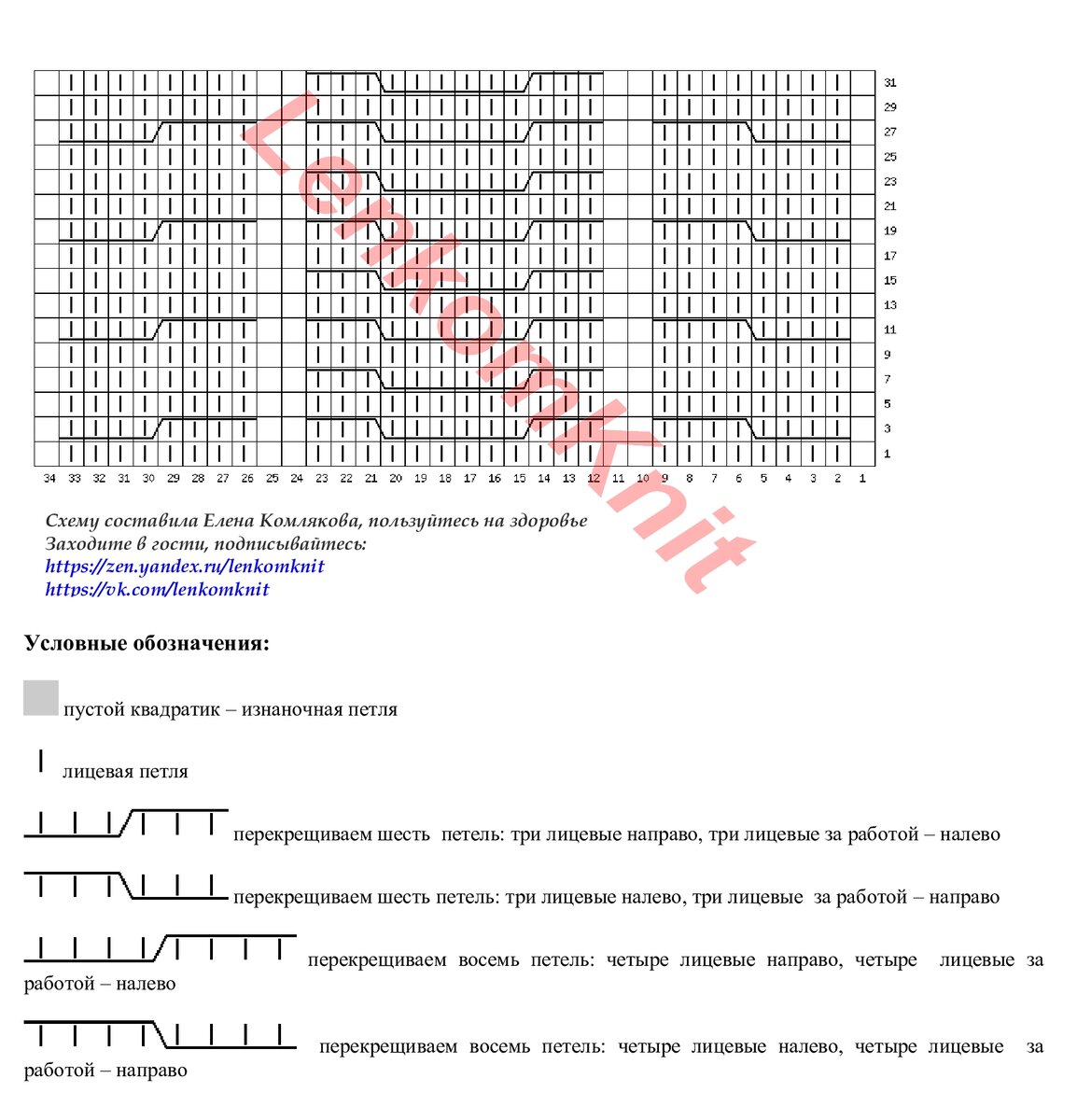 На рисунке - схема узора, он очень простой. Это косы. Их можно делать шире или уже по желанию (например, вязать не из 8 петель косу, а уже - из 6 или шире - из 10 петель).