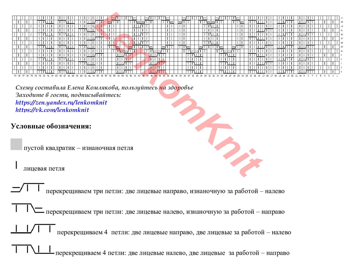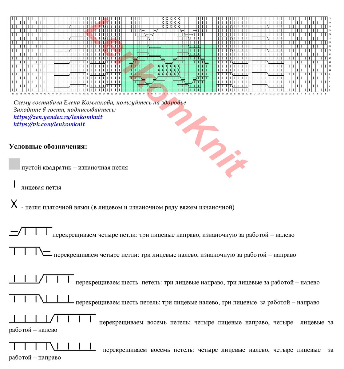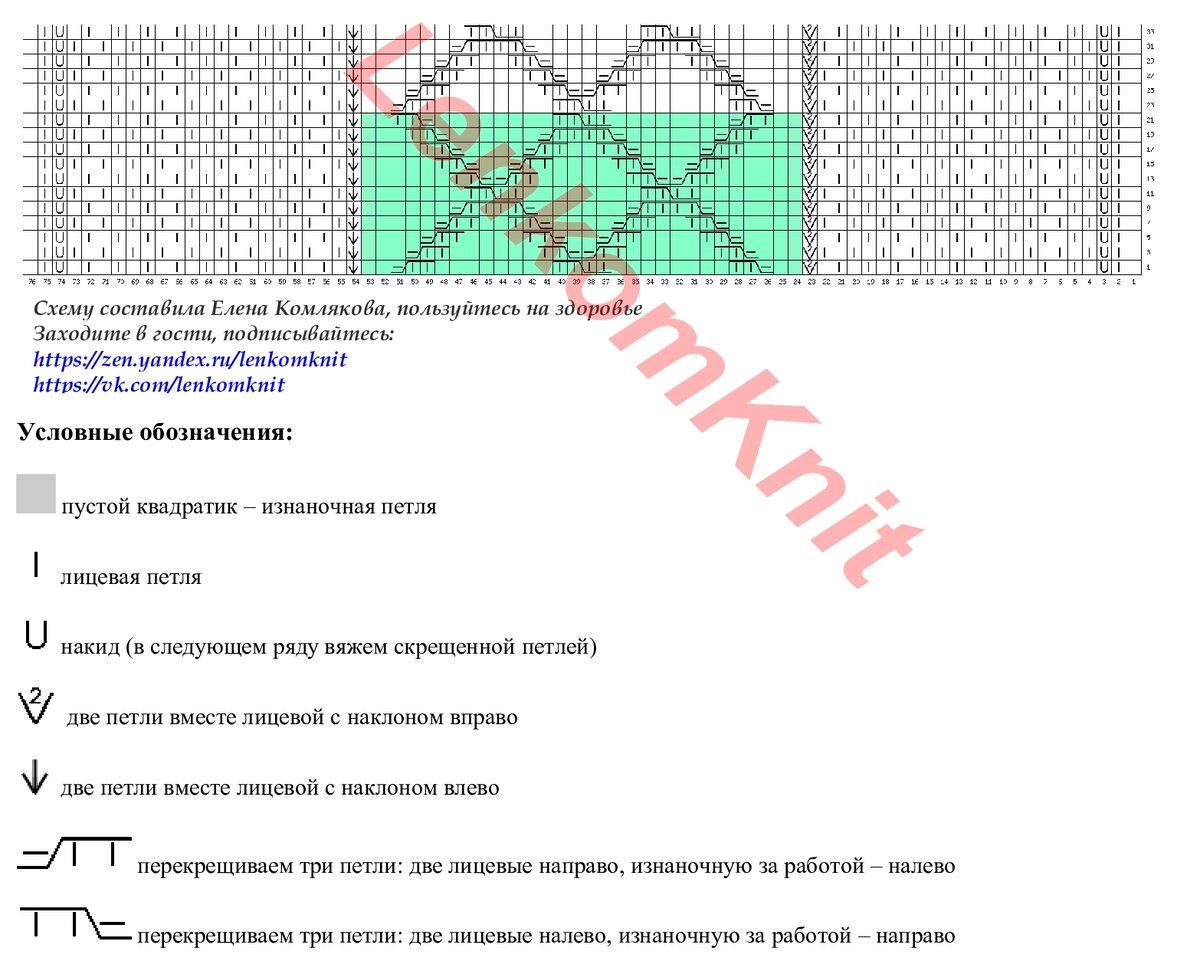 Схема узора для лицевых рядов. На схеме - полный раппорт центрального узора в высоту