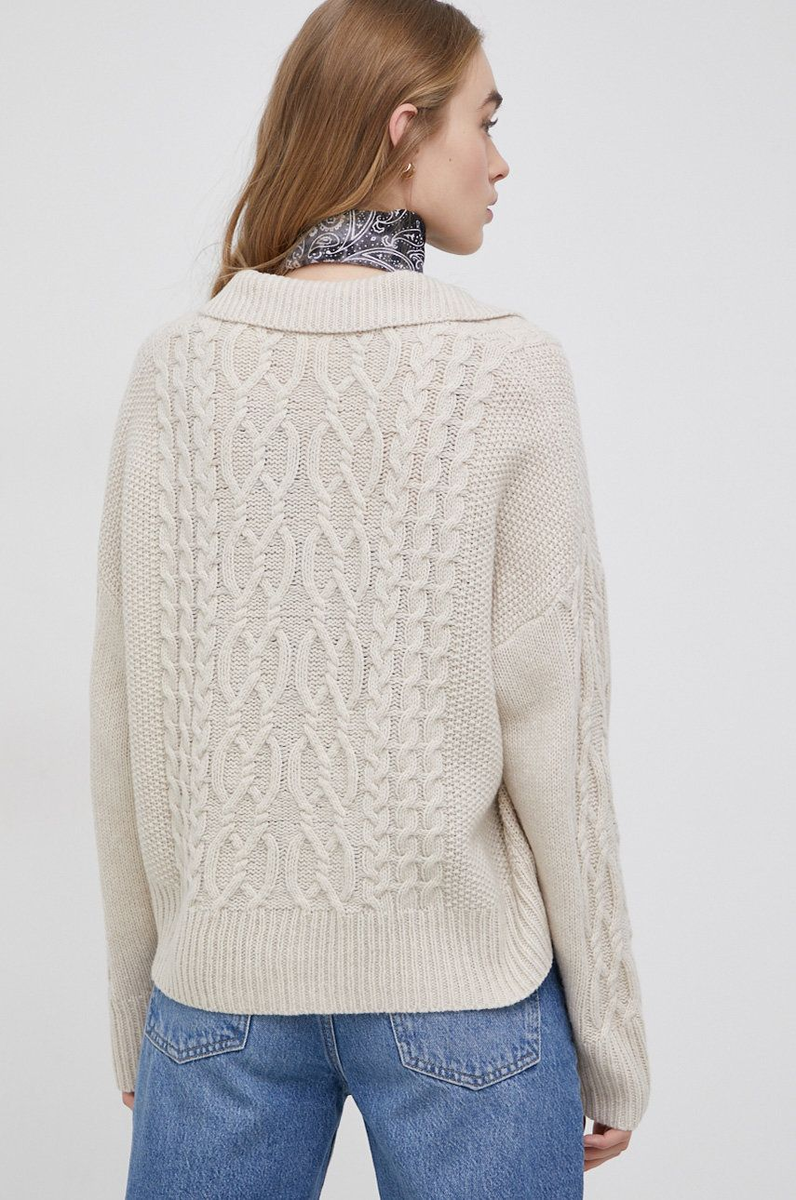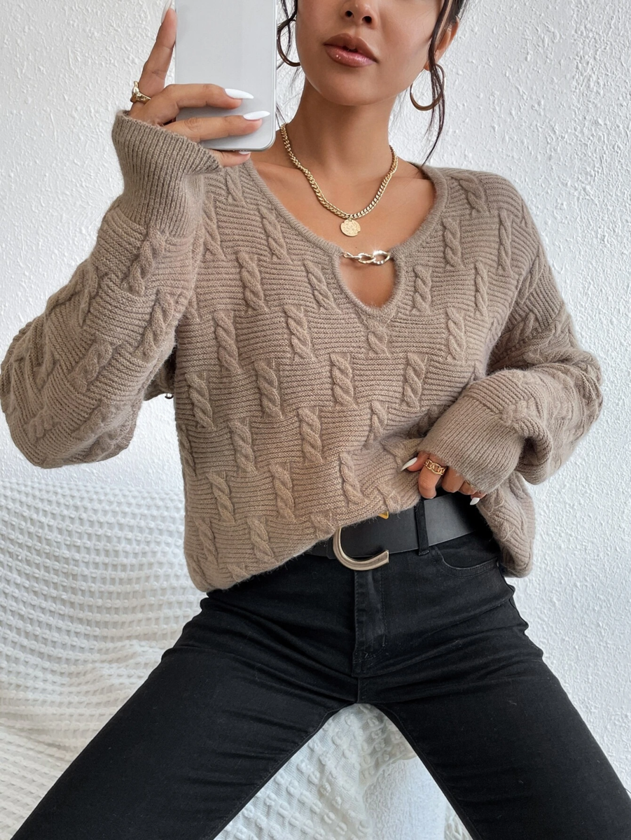 Последний свитер в этой подборке - самый простой, но он очень интересно задуман. Ворот (почти поло) связан с небольшим круглым вырезом в центре. Рукав внизу широкий, не стянут резинкой.