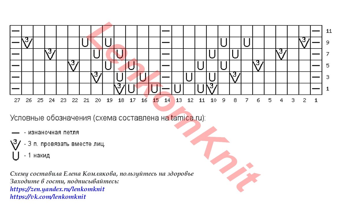 Узор рукава виден не очень хорошо, фотографий, где он виден целиком, нет. Думаю, это один из вариантов популярного узора - ажурные листики. На схеме нарисован полный раппорт этого узора в ширину (27 петель) и в высоту (11 петель).
