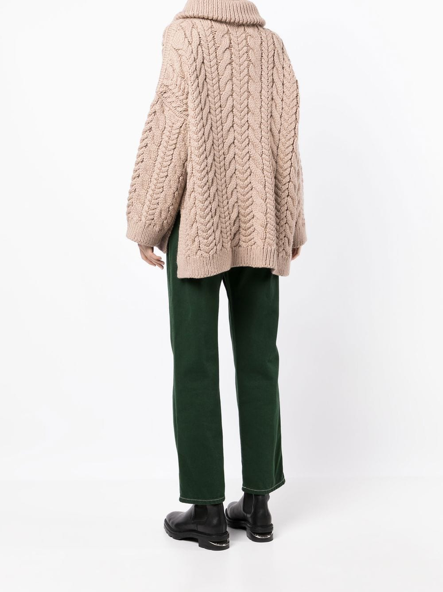 Свитер связан из очень толстой пряжи, модель удлиненная, по бокам разрезы. Видно, что свитер этот очень теплый, но слишком объемный и под верхнюю одежду его надевать будет проблемно.