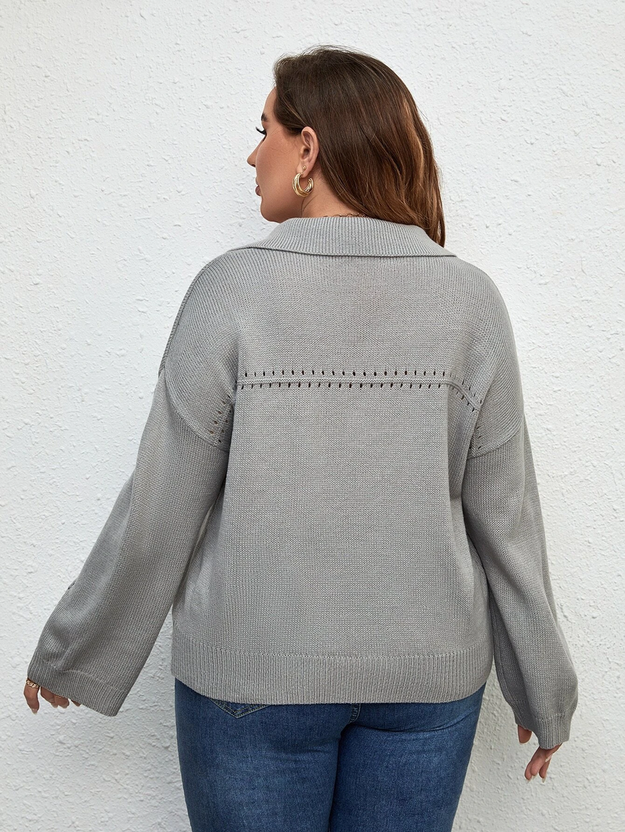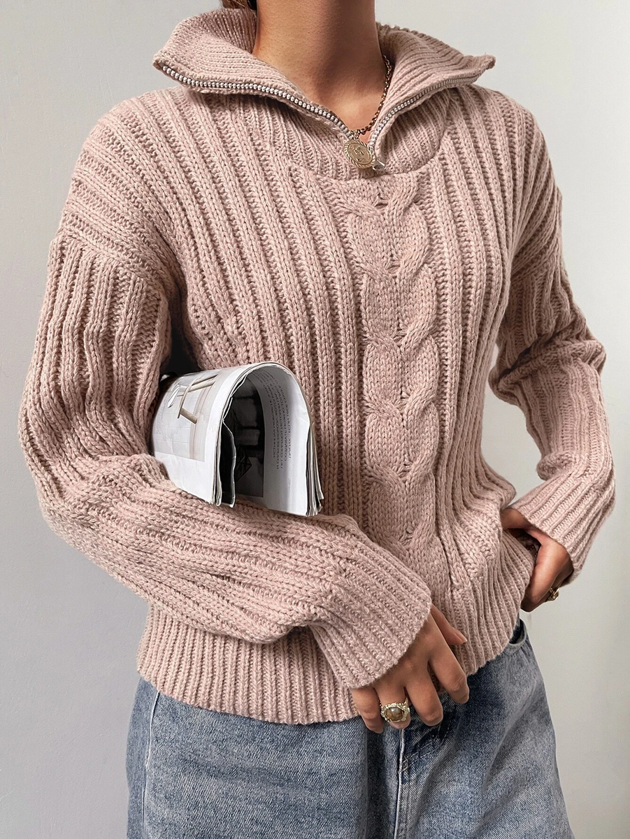 В этом свитере, кроме воротника-поло на молнии, есть еще интересный рельефный узор - аран по центру и диагональная полупатентная резинка по бокам.