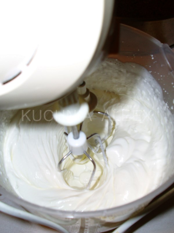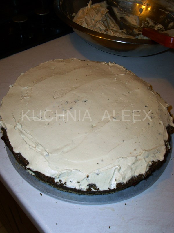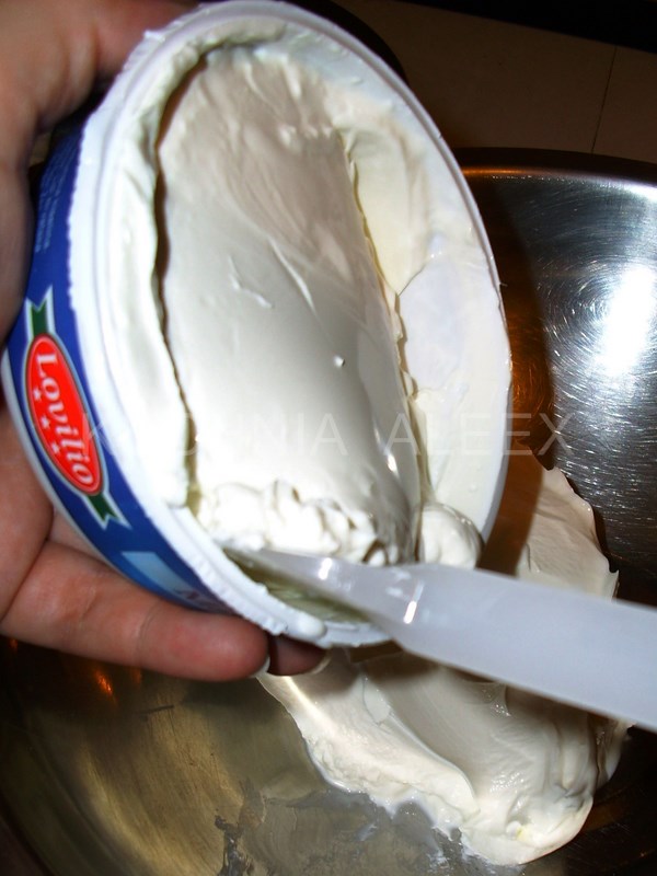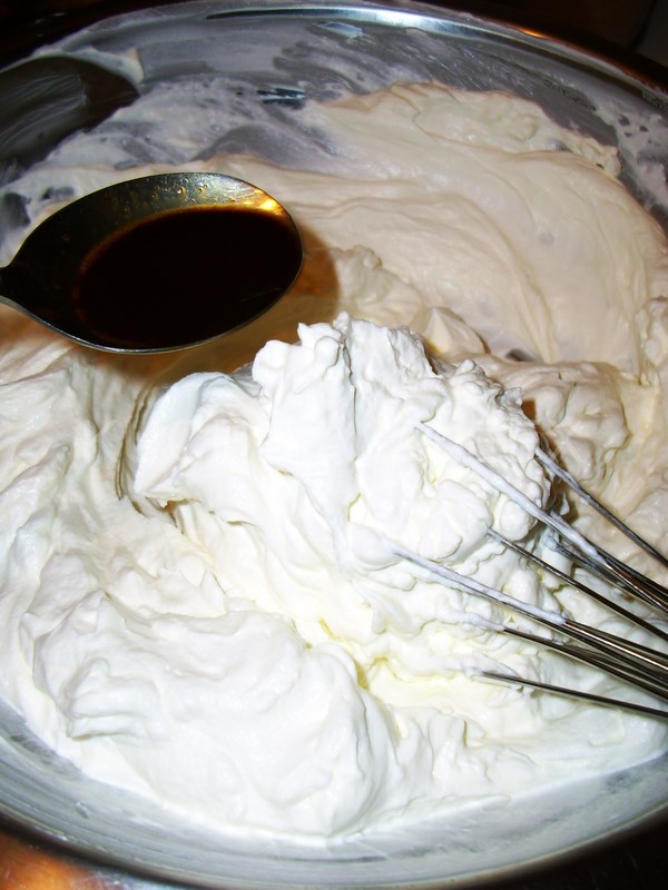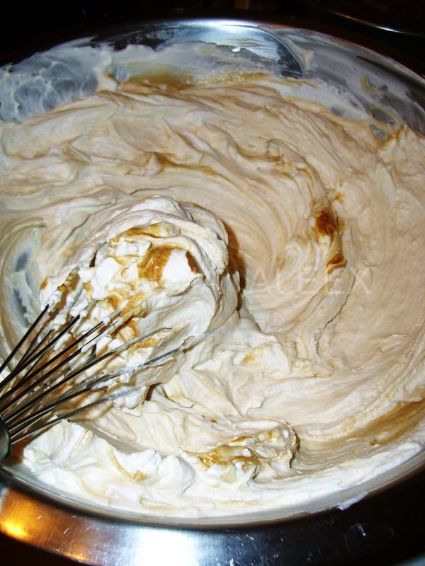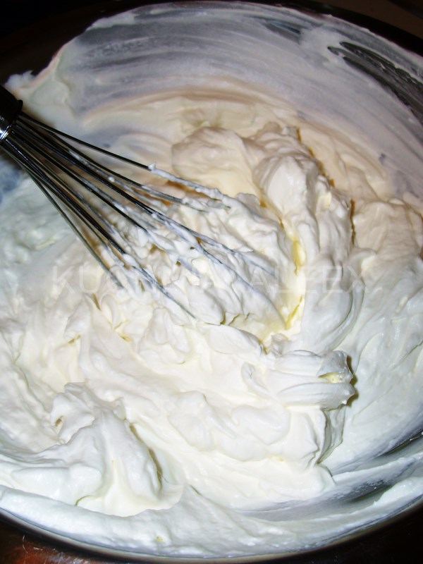 7 Подготовьте кофейный мусс: взбить сливки с сахарной пудрой в жесткие пики . Добавляйте по ложке сыр маскарпоне, а затем охлажденный кофе.