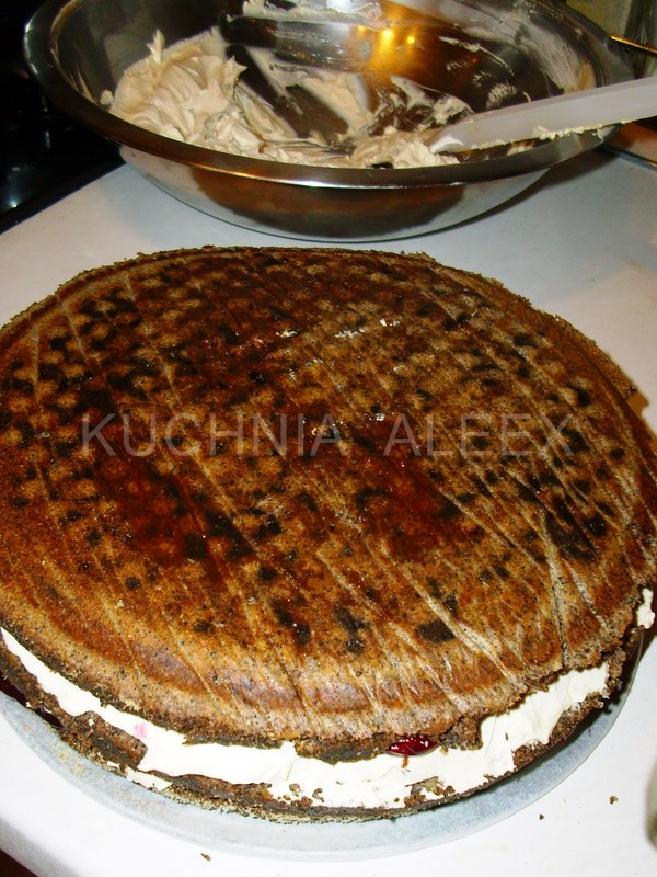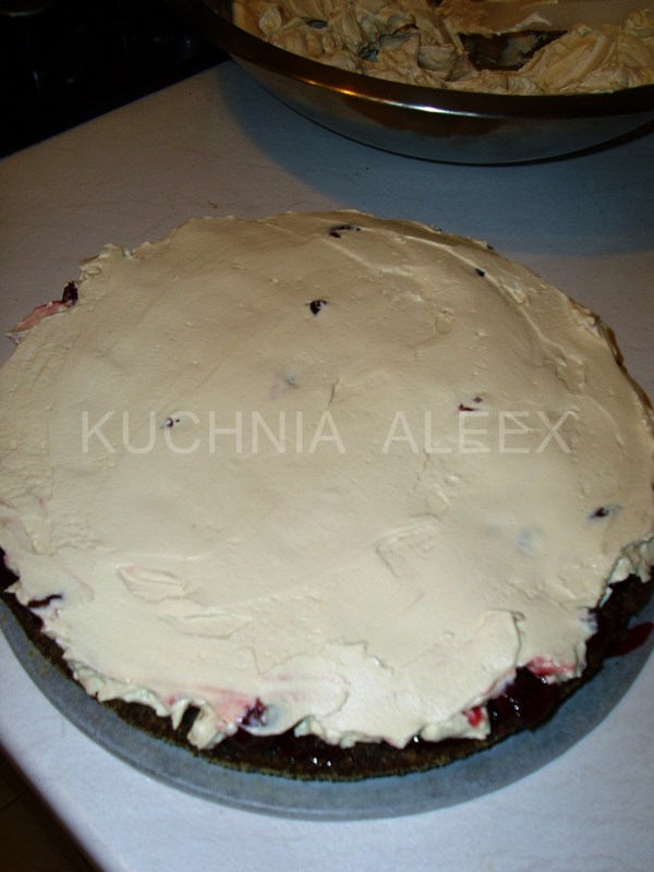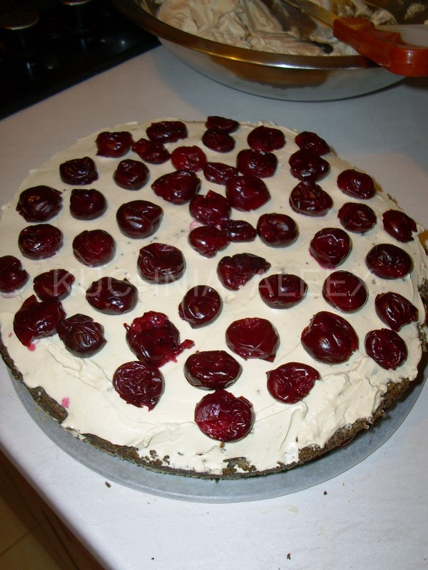 На корж налить варенье с целыми вишнями, положить 1/3 кофейный мусс.