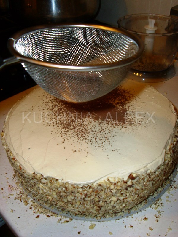 13 Стороны торта посыпать нарезанным фундуком, посыпать сверху с большим количеством какао-порошка (лучше это делать перед подачей на стол). Охладите, желательно на ночь.