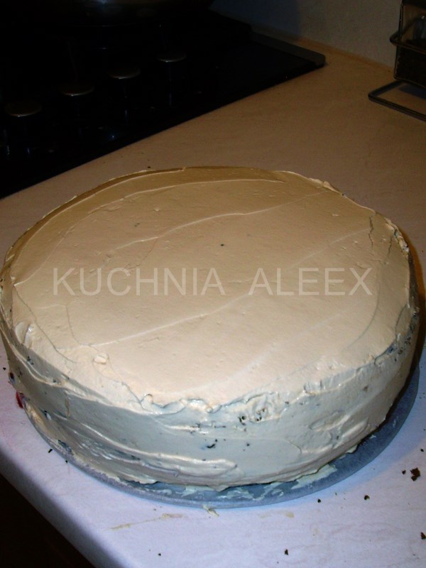 Накрыть третьим коржом . Распределить остатки крема сверху и по бокам торта.