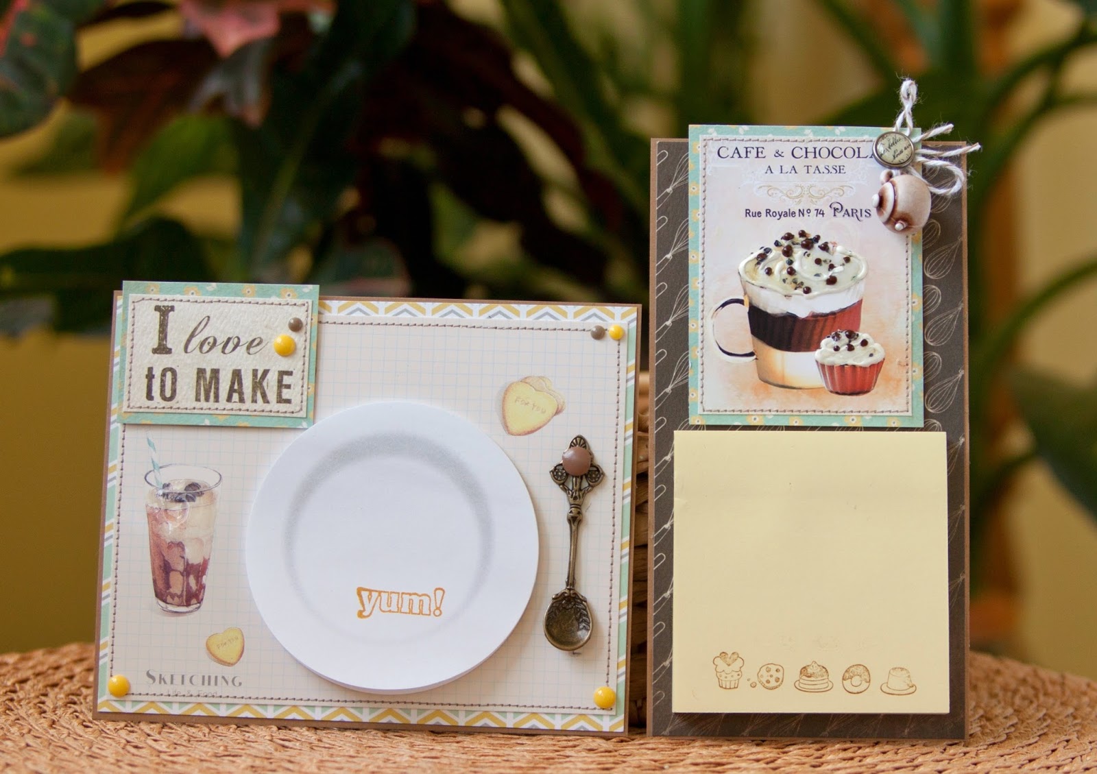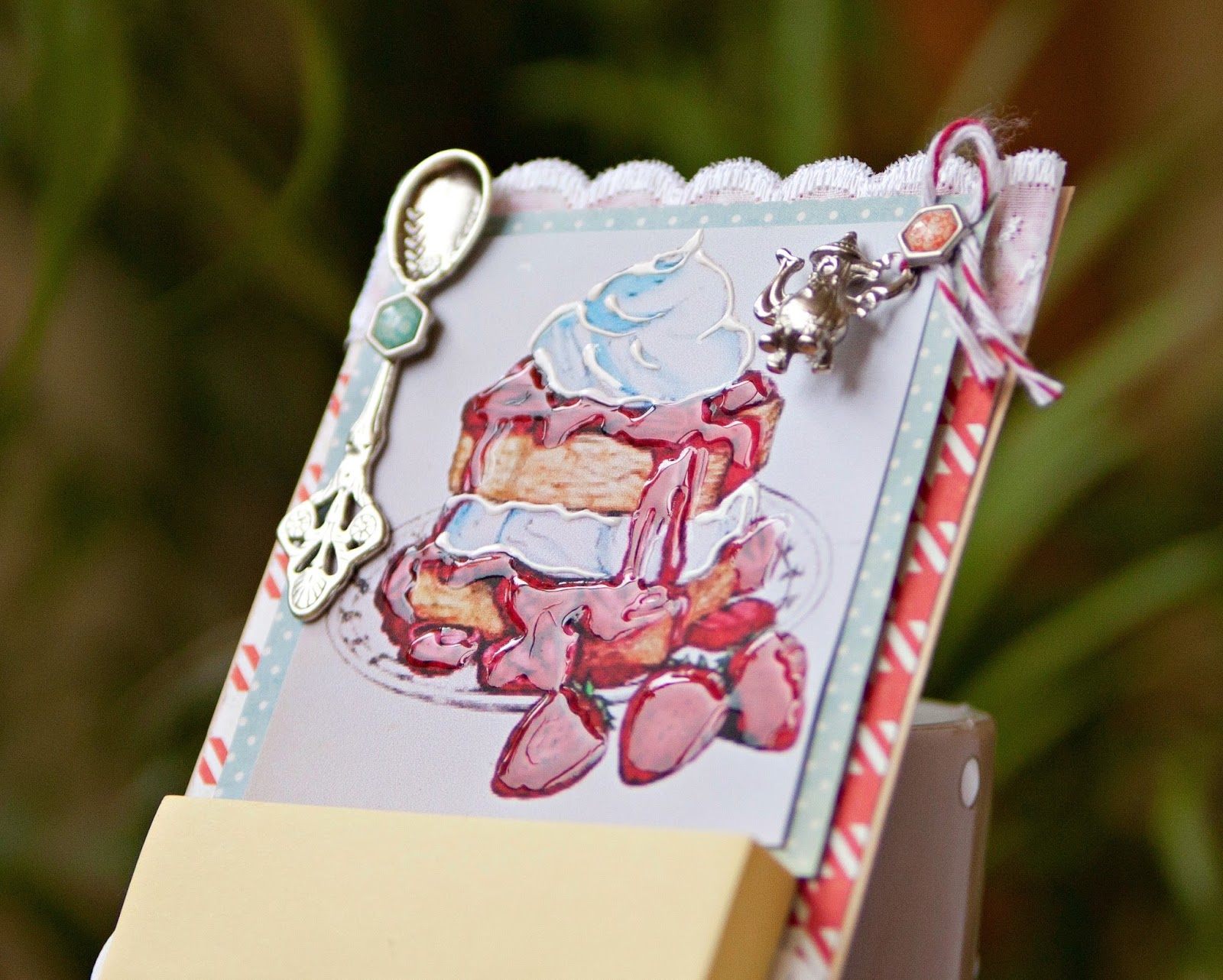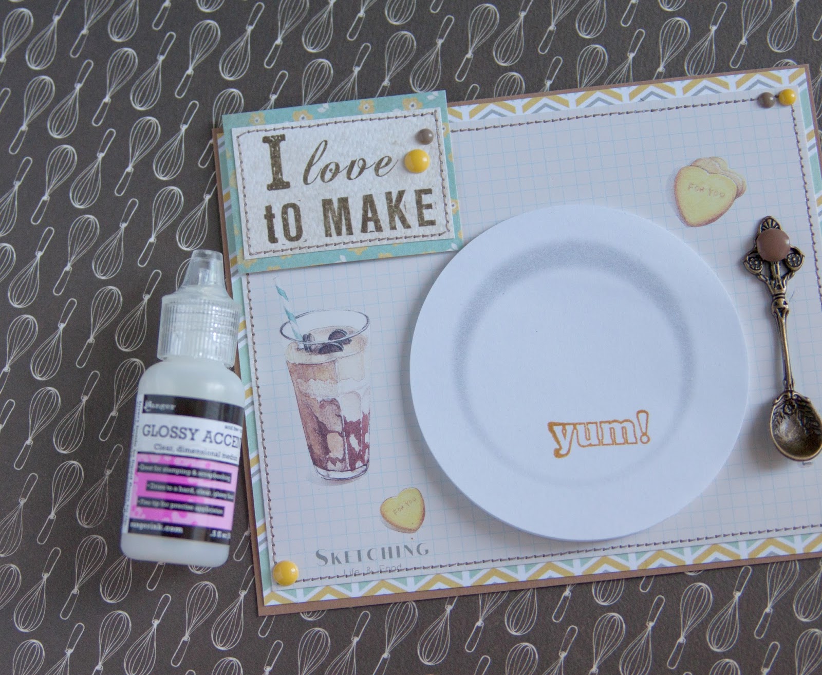 карточку сос тикерами я приклеила к скрпабумаге, прошила на машинкеи прикрепила с помощью брадс ложку.