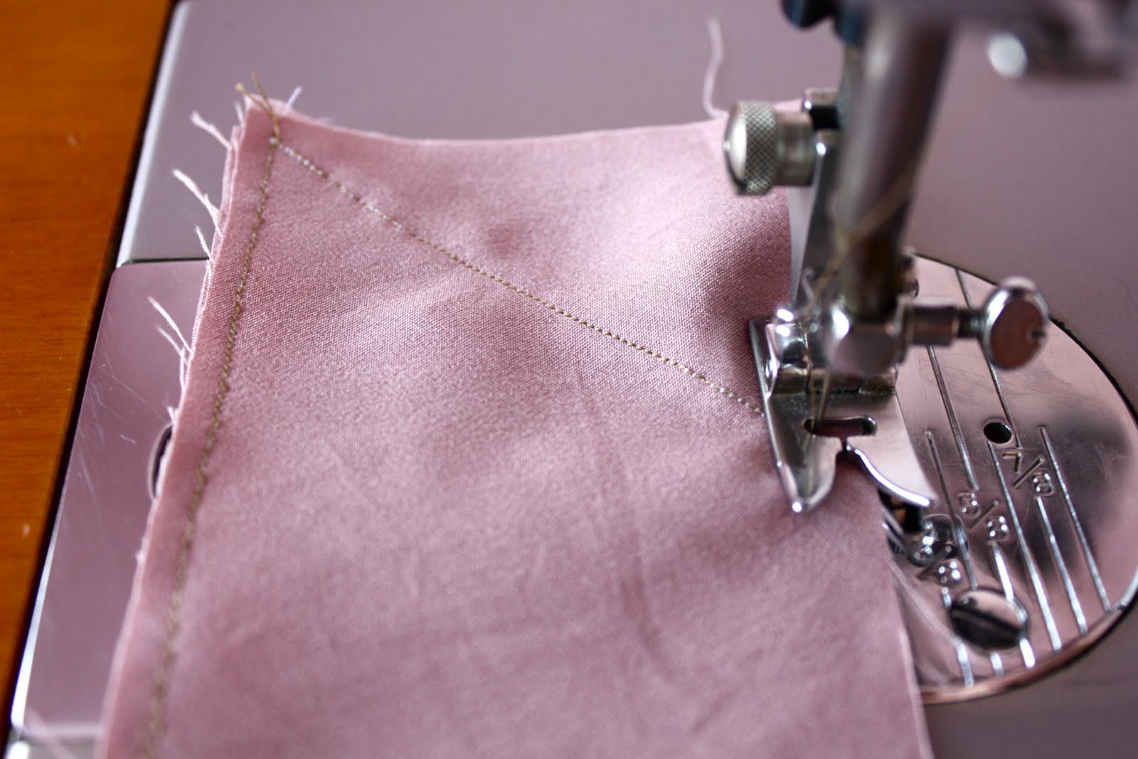 Now that you have sewn your two strips together you have a 6" wide by 90" long strip. Fold the sash in half hot dog style and sew a point as shown below. Then continue to sew down the long (90") side.
