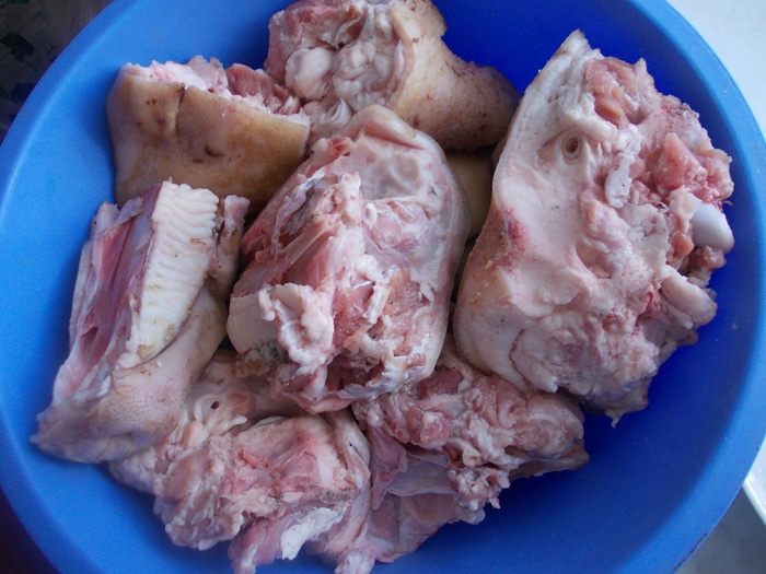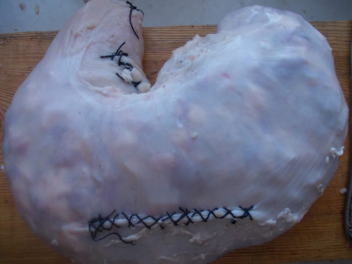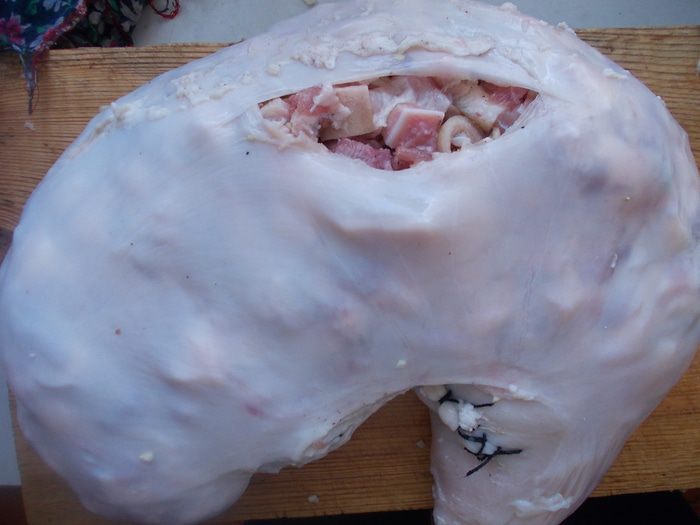 [показать]Очень много рецептов сальтисона. Если нет возможности найти желудок, хозяйки находят другие, разнообразные способы приготовления. Делают мешочки из марли, обрезают пластиковую бутылку (тогда получается после застывания в форме колбасы). И много, много разных других идей. Насчет начинки, тоже можно класть любую. Главное, чтобы была голова, для застывания. А мясо можно положить любое. Именно украинского варианта,1 кг свиной головы и 1 кг свинины. Но можно вместо свинины положить курицу или индейку, а можно сделать ассорти.