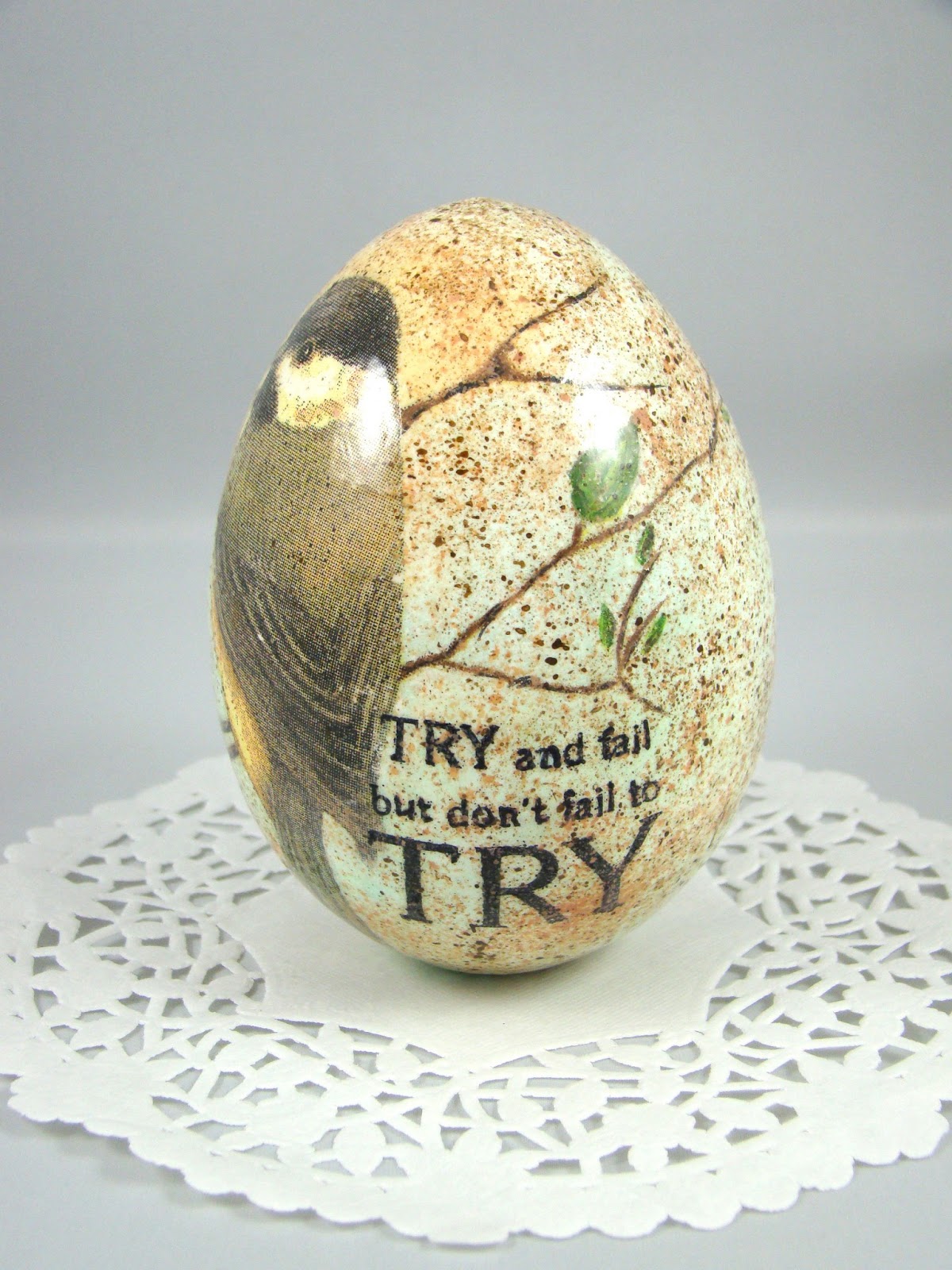 7. Покрыли яичко 2 -мя слоями лака. Просушили. Теперь делаем набрызг акриловой краской. Как делать вспоминаем здесь. Я сделала 2 красками: Умбра жженая и Сиена. После высыхания капелек, стираем лишнее с птички и элементов, которые этого требуют.