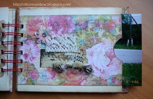 Странички склеены в виде кармашков, куда вкладываются фотографии. Много места для журналинга. Закрывается альбом на тесемочку, которая цепляется за брадс.