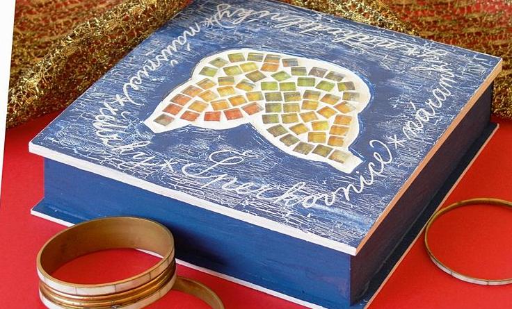 1.  Подарочная и декоративная коробка может быть  из древесины или твердого картона. В качестве подклада под прозрачную  мозаику используем мотив  из  салфетки. На крышке начертим   прямоугольник или квадрат и закрасим его  белой акриловой краской.