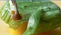 9. Полосы клеим одну за другой на заднюю сторону тарелки а кистью разглаживаем пузыри. Полосы клеим, накладывая их краями друг на друга (край приблизительно 0,5 см). После приклеивания положим тарелку на кастрюльку, чтобы края тарелки лучше приклеились.