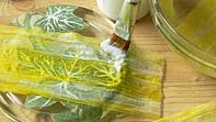 2. Стеклянную тарелку перевернем нижней стороной к себе и намажем клеем для декупажа то место, куда приклеим рисунок из салфетки. Приложим рисунок и разгладим мягкой кистью, намоченной в клей.