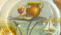 6. После высыхания опять белой краской выделим некоторые детали - яркие блики на гранях стола, светлейшие места на кувшине, искры света на бокале и т.д. Перевернув тарелку, увидим результат.