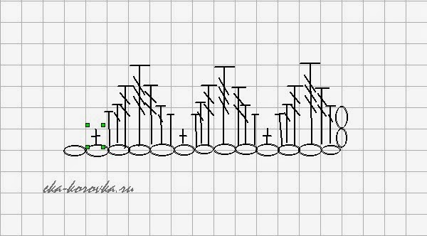 Таким образом провязываю 9 рядов, нить обрываю, закрепляю. Далее вяжу лепестки по нижеприведенной схеме. Простите за корявость, но я как художник не очень))) Сразу оговорюсь, что нижний ряд - это не воздушные петли, это петли предыдущего ряда столбиков без накида. Получается следующее: желтой нитью делаем две вп подъема, в ту же петлю провязываем ссн и сс2н, в следующую один сс3н, в следующую опять три столбика (сс2н, ссн,пст), далее сбн. И повторяем, провязывая вместо первых двух вп, полустолбик. Получается всего 12 лепестков.