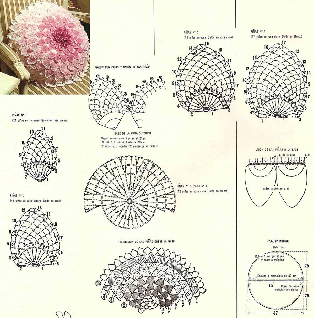 Скорее всего, вяжется круг-основа (точнее, два; нужна ведь еще и обратная сторона подушки), отдельно вяжется большое количество листочков, а потом все это крепится с помощью столбиков без накида (есть там такой намек в правой части листа со схемами) в несколько кругов.