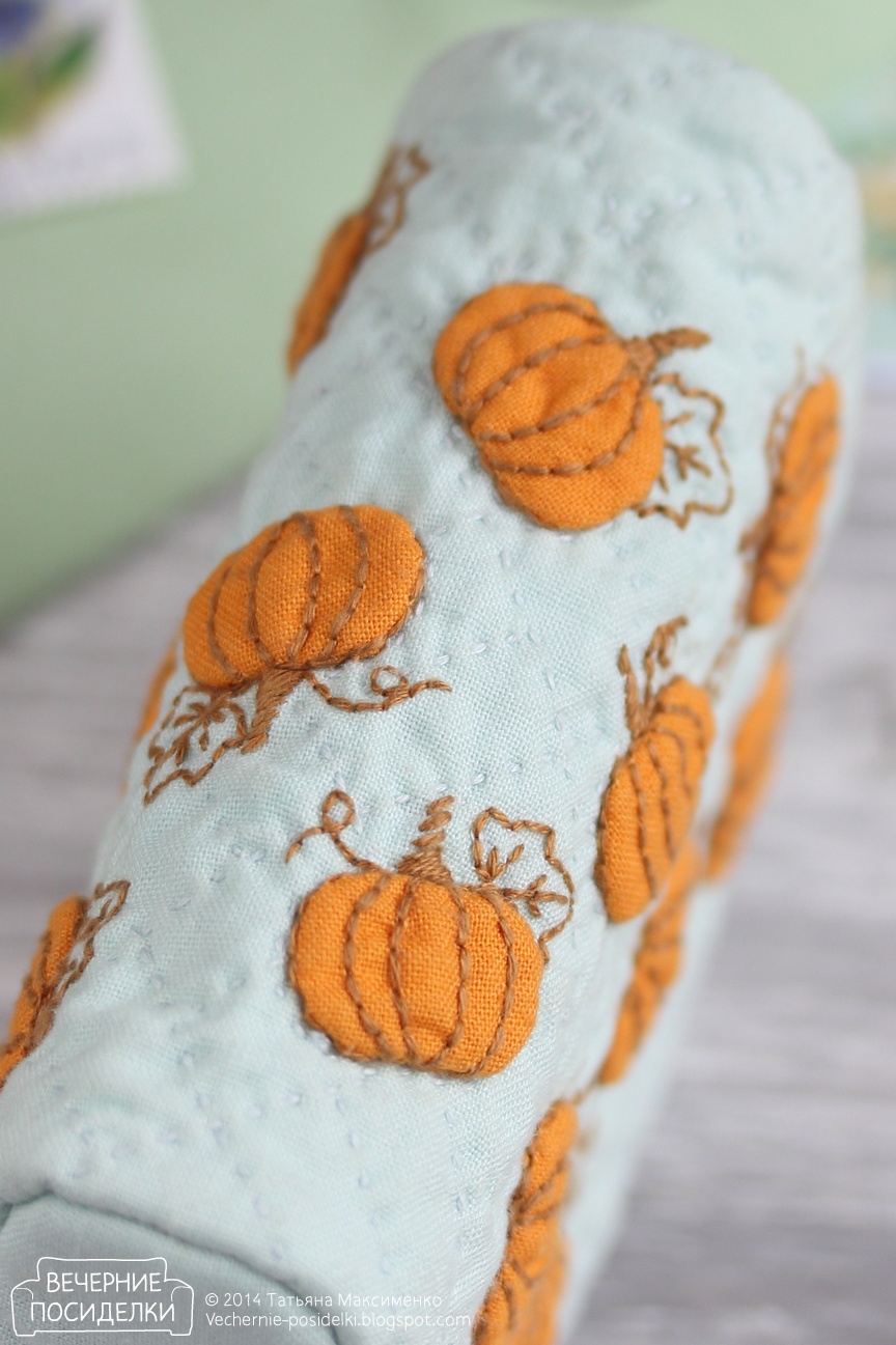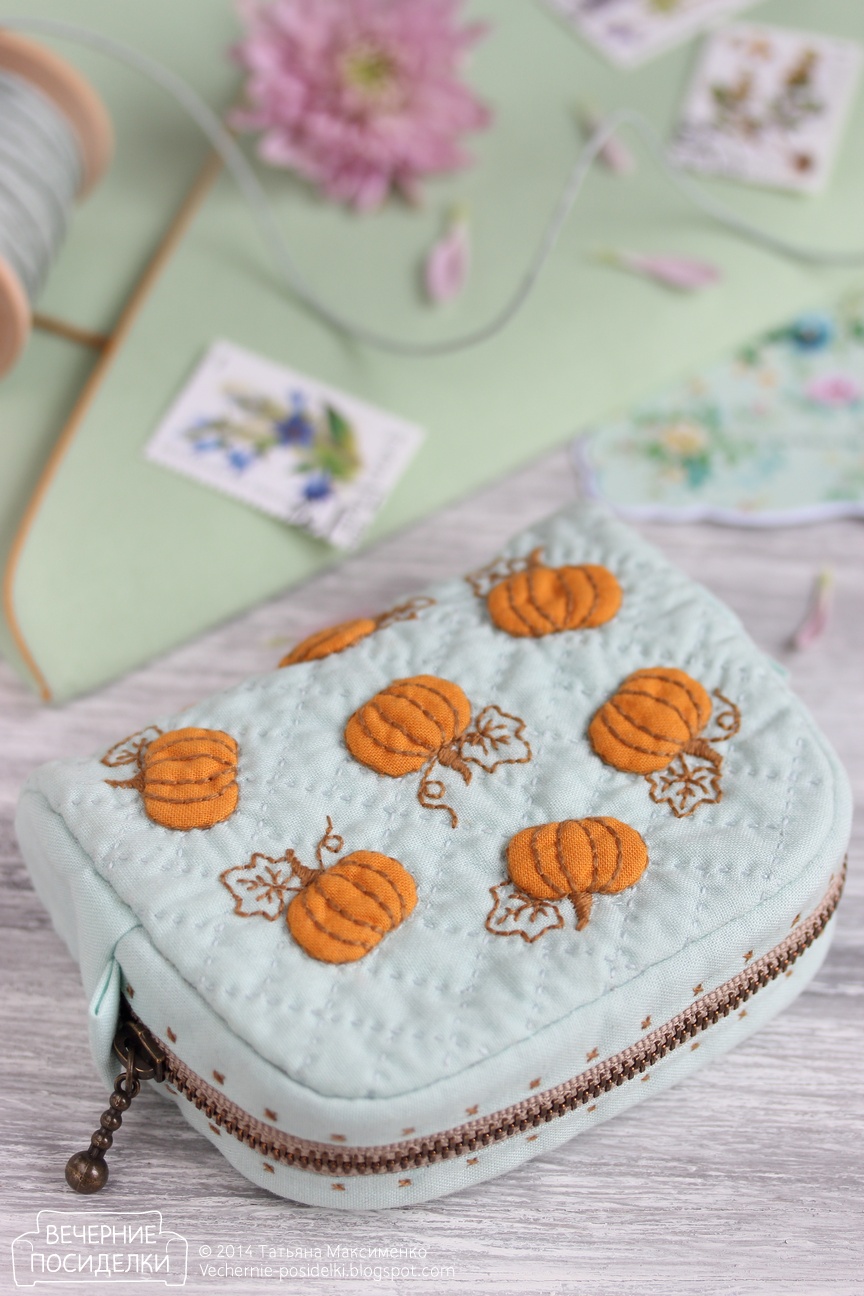 Тыковки размером 2х1,3см — объёмная аппликация. На косметичку вместилось 15 штук. Основа простёгана прямоугольниками, направленными в разные стороны.