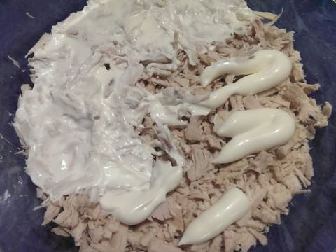 Мелко режем заранее отваренную куриную грудку и выкладываем очередной слой, смазываем майонезом.