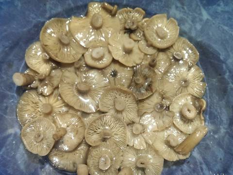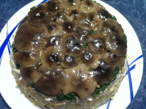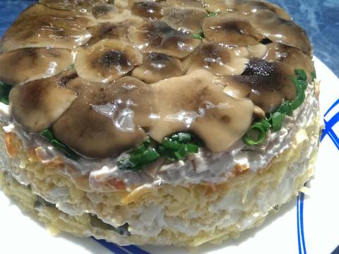 Классический рецепт нам говорит использовать шампиньоны. А мы по осени набрали и замариновали опят - надо есть. Вот маринованные опятки (шляпки) мы и будем использовать. Выкладываем на форму