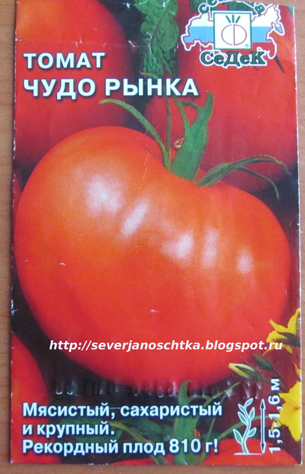 Я уже писала о том, что мне нравятся крупные помидоры, поэтому, увидев надпись на пакетике, сразу его купила. Производитель обещал не только крупноплодность, но и товарность (понятно, ведь в названии есть словорынок); помидоры высокого качества: вкусные, сахаристые, мясистые. Форма плодов может быть округлой или плоскоокруглой. Растения томатов этого сорта высокорослые - до 160 см, их нужно подвязывать и пасынковать, выращивать в теплице. Томаты сорта Чудо рынка относятся к среднепоздним - от всходов до плодоношения 112 - 120 дней.