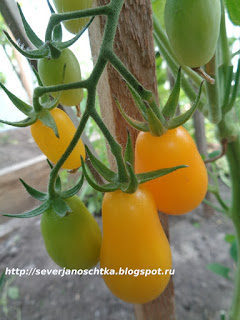 Приятная новинка сезона - томаты Медовая капля. Таких помидоров, с желтыми плодами капельками, я никогда не выращивала! Когда томаты были на стадии рассады, обратила внимание на то, что лист у них картофельного типа (мне нравятся томаты с картофельным листом) и на то, что они в общем-то неприхотливы. В теплице томаты быстро освоились, зацвели и порадовали первыми сладкими помидорками.