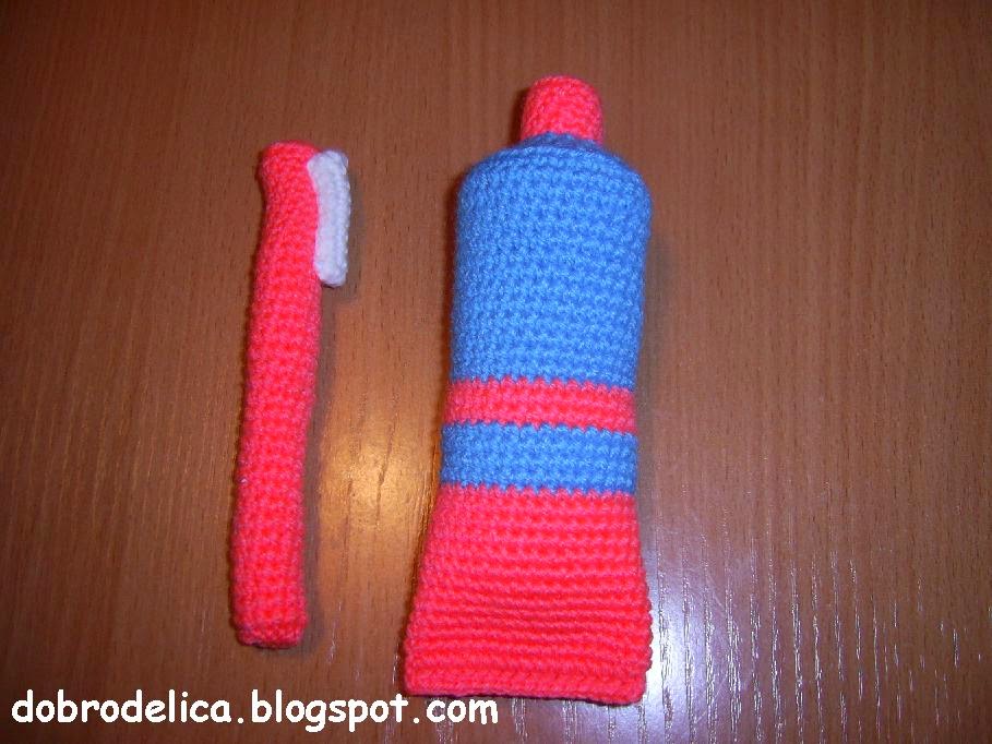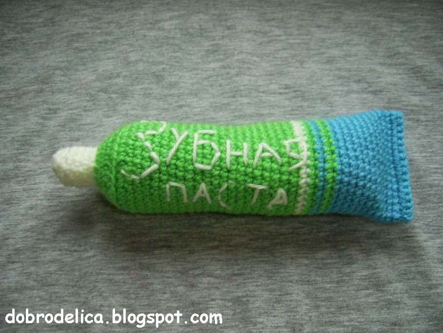 Теперь дадим зубику в ручки пасту и щётку, белой ниткой пришив средние пальчики, чтоб паста и щётка не выпадали.