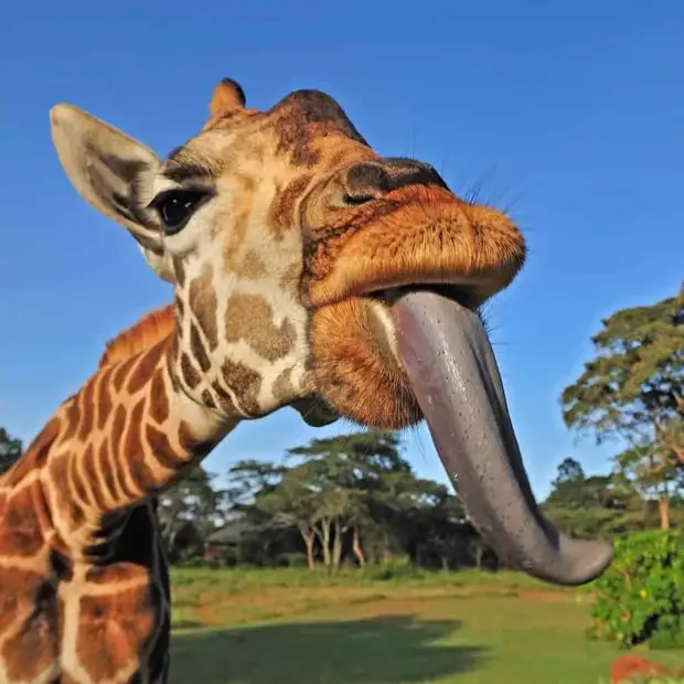 Это настоящее чудо природы, которое конечно же прежде всего предназначено для кормления - языком жираф обрывает молодые и сочные побеги, обхватывая их как хоботом. Но при желании жираф может и почистить языком свои ушки, ведь высунуть этот орган жираф может почти на полметра - до 45 сантиметров. Этого вполне хватает жирафу, чтобы кончиком языка достать до ушей, не говоря уже про ноздри. А еще у жирафа самое большое сердце и самое высокое кровяное давление из всех наземных животных.
