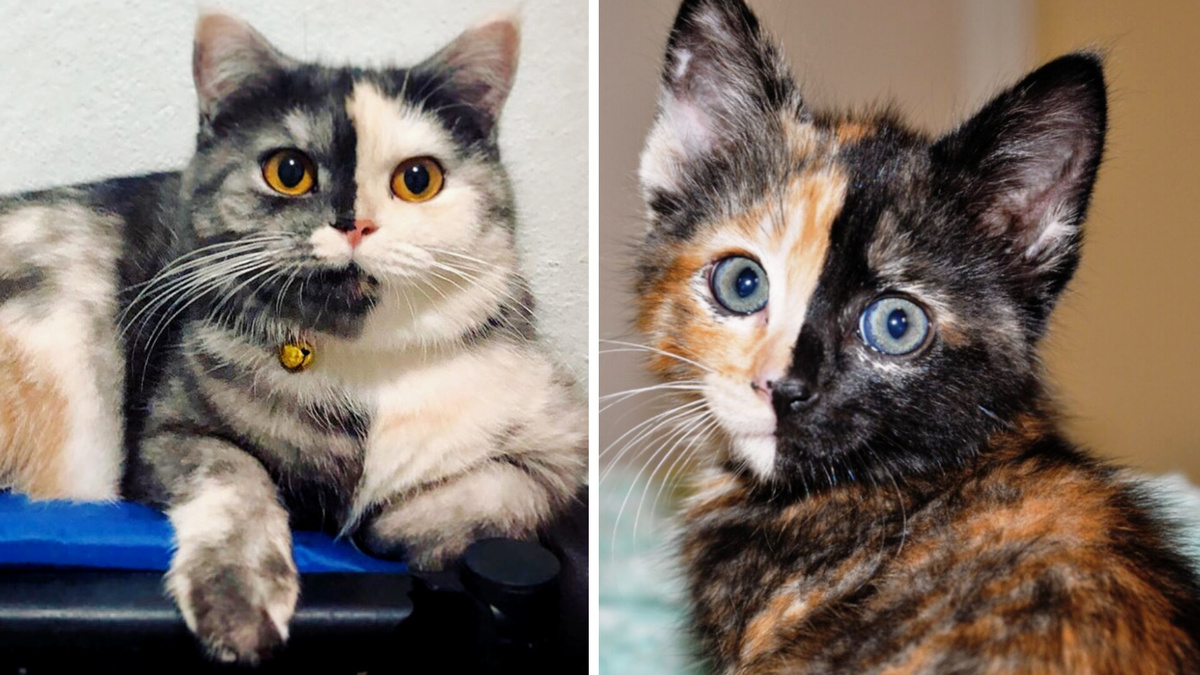 Фотографии таких кошек поражают: мордочка разделена на две половины — например, чёрную и рыжую.