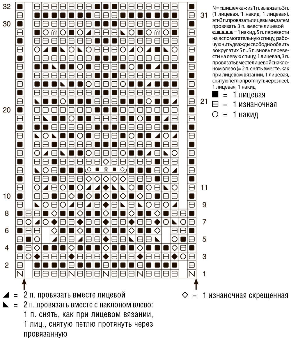 Вязать по приведенной схеме. Петли распределить, как описано в инструкции. В высоту постоянно повторять 1–32-й р.